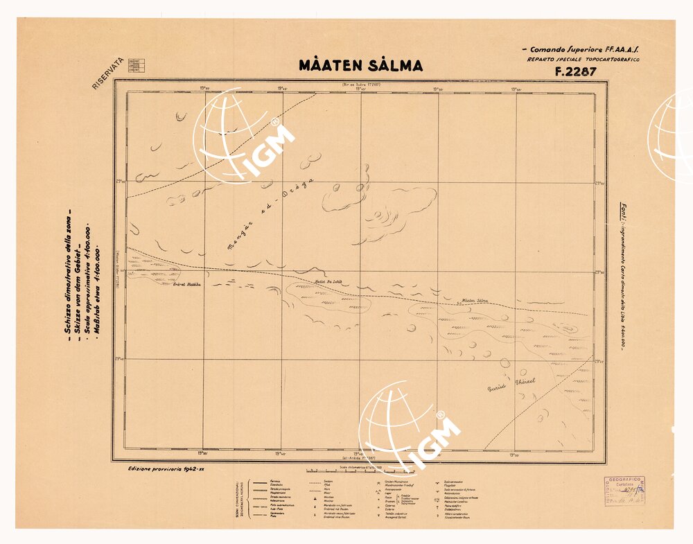 COMANDO SUPERIORE F.F.A.A. REPARTO SPECIALE TOPOCARTOGRAFICO. Ingrandimento Carta dimostrativa della Libia 1:400.000 rilevamento della costa eseguito dalla R. Marina tracciato della Via Balbia dell’Ufficio Spec.le della Strada. Itinerari vari eseguiti da topografi dell’I.G.M. determinzioni astronomiche speditive e triangolazioni trigonometriche dell’I.G.M. e delle R. Marina. Informazioni varie.