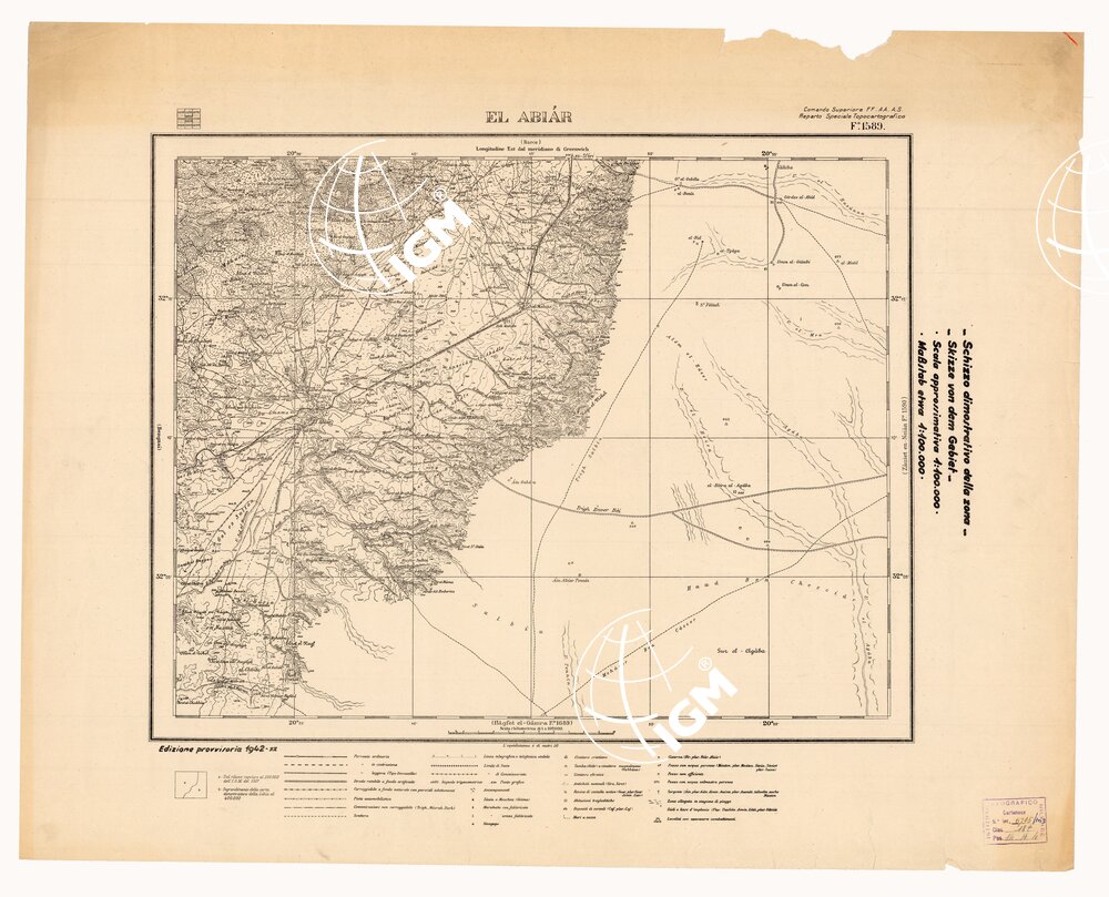 COMANDO SUPERIORE F.F.A.A. REPARTO SPECIALE TOPOCARTOGRAFICO. Ingrandimento Carta dimostrativa della Libia 1:400.000 rilevamento della costa eseguito dalla R. Marina tracciato della Via Balbia dell’Ufficio Spec.le della Strada. Itinerari dell’I.G.M. determinazioni astronomiche speditive e triangolazioni trigonometriche dell’I.G.M. e della R. Marina. Informazioni varie.