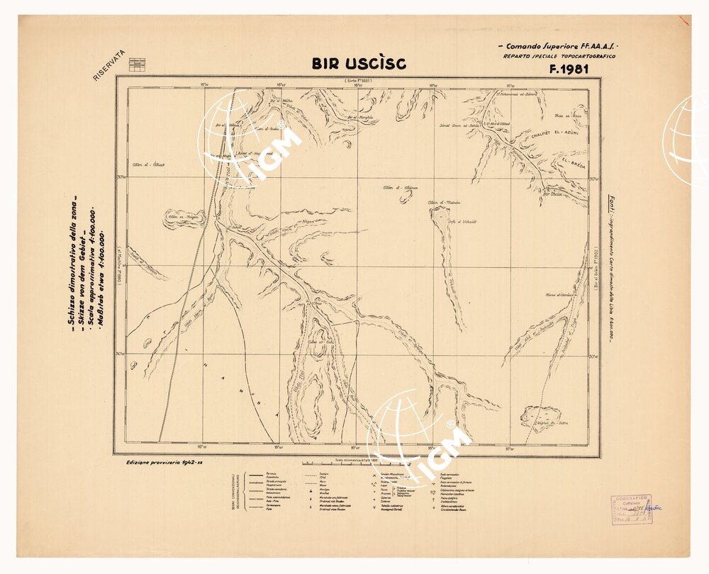 COMANDO SUPERIORE F.F.A.A. REPARTO SPECIALE TOPOCARTOGRAFICO. Ingrandimento Carta dimostrativa della Libia 1:400.000 rilevamento della costa eseguito dalla R. Marina tracciato della Via Balbia dell’Ufficio Spec.le della Strada. Itinerari vari eseguiti da topografi dell’I.G.M. determinazioni astronomiche e speditive e triangolazione trigonometriche dell’I.G.M. e della R. Marina. Informazioni varie.