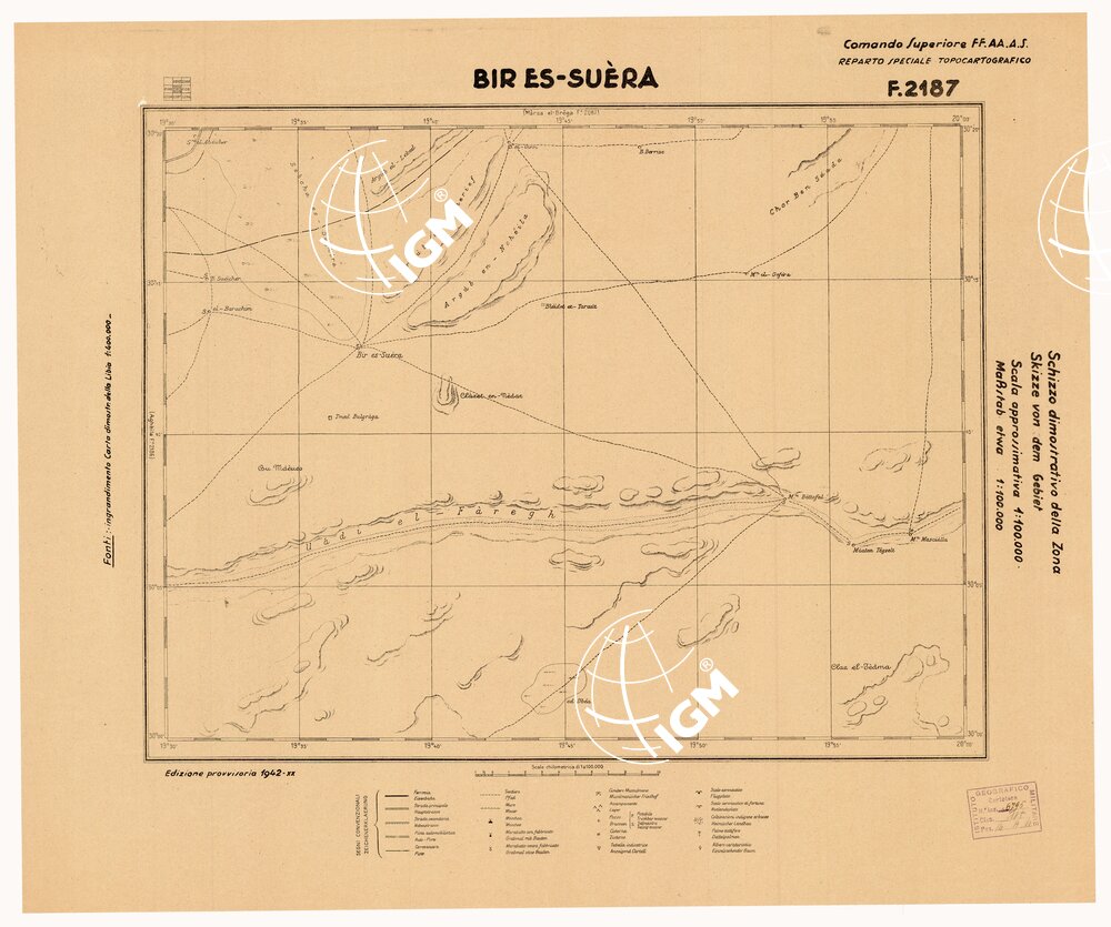 COMANDO SUPERIORE F.F.A.A. REPARTO SPECIALE TOPOCARTOGRAFICO. Ingrandimento Carta dimostrativa della Libia 1:400.000 rilevamento della costa eseguito dalla R. Marina tracciato della Via Balbia dell’Ufficio Spec.le della Strada. Itinerari vari eseguiti da topografi dell’I.G.M. Determinazioni astronomiche speditive e triangolazioni trigonometriche dell’I.G.M. e della R. Marina informazioni varie.