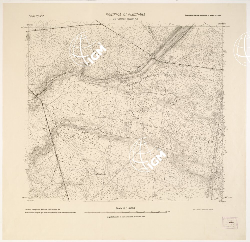 Rappresentazione orografica a curve di livello, l’equidistanza fra le curve orizzontali è di metri 0,50. I.G.M., pubblicazione eseguita per conto del Consorzio della Bonifica di Piscinara.