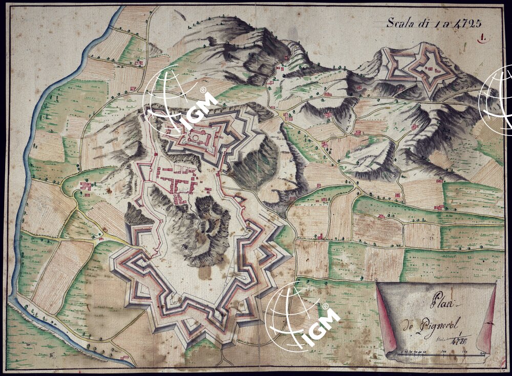 | Note foto | Questa pianta ha spiccato carattere militare. Reca nel verso la scritta "Forteresse de Pignerol". Le fortificazioni vi sono disegnate con molta cura. |
