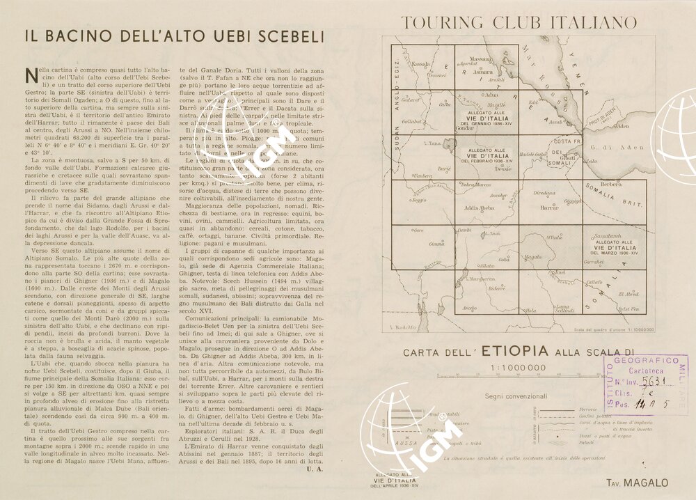 Sul retro della carta sono presenti: un quadro d’unione alla scala di 1:10.000.000 rappresentante la localizzazione geografica della carta stessa, l’articolo sul bacino dell’alto Uebi Scebeli, ed i segni convenzionali. Touring Club Italiano; Offic. Fotolitografiche S. A., Milano.