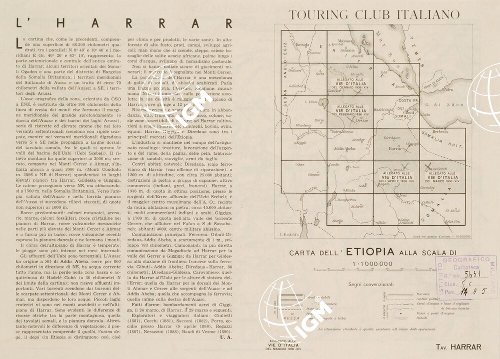 Sul retro della carta sono presenti: un quadro d’unione alla scala di 1:10.000.000 rappresentante la localizzazione geografica della carta stessa, l’articolo sulla zona dell’Harrar, ed i segni convenzionali. Touring Club Italiano; Offic. Fotolitografiche S. A., Milano.