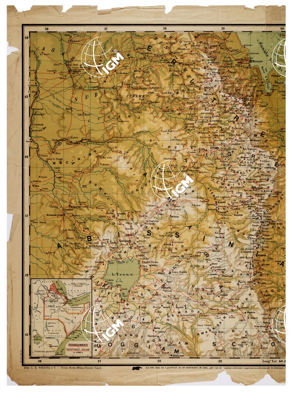Rappresentazione orografica a sfumo. Nel riquadro in basso a sinistra la carta dei possedimenti e protettorati italiani in Africa alla scala di 1:18.000.000. La rete bleu ha i quadrati di 50 chilometri di lato, per cui si possono calcolare approssimativamente le distanze orizzontali tanto da Massaua a qualsiasi località, come quelle fra le località stesse. La carta è disegnata da Domenico Locchi; G.B. Paravia & C.