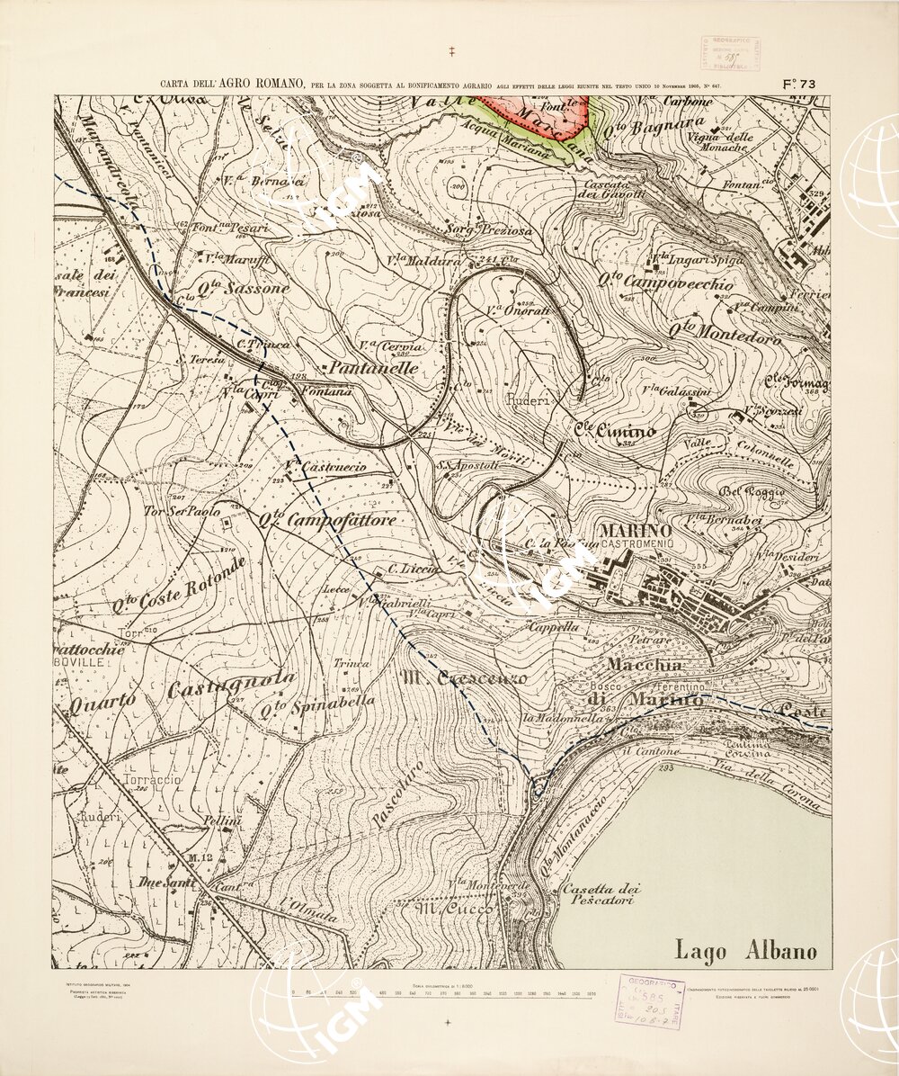 Ingrandimento fotozincografico in 77 fogli delle tavolette rilievo al 25.000. Stampa a colori in azzurro per le acque, verde per i limiti dell’agro romano, rosso per quelli della zona soggetta alla bonifica agraria, viola per il territorio suburbano di Roma, rosso per le tenute e le loro divisioni interne; azzurro per le linee di spartiacque; resto della planimetria in nero. Orografia a curve tracciate alla equidistanza di 5 metri. Annesso un quadro d’unione con elenco delle tenute private.