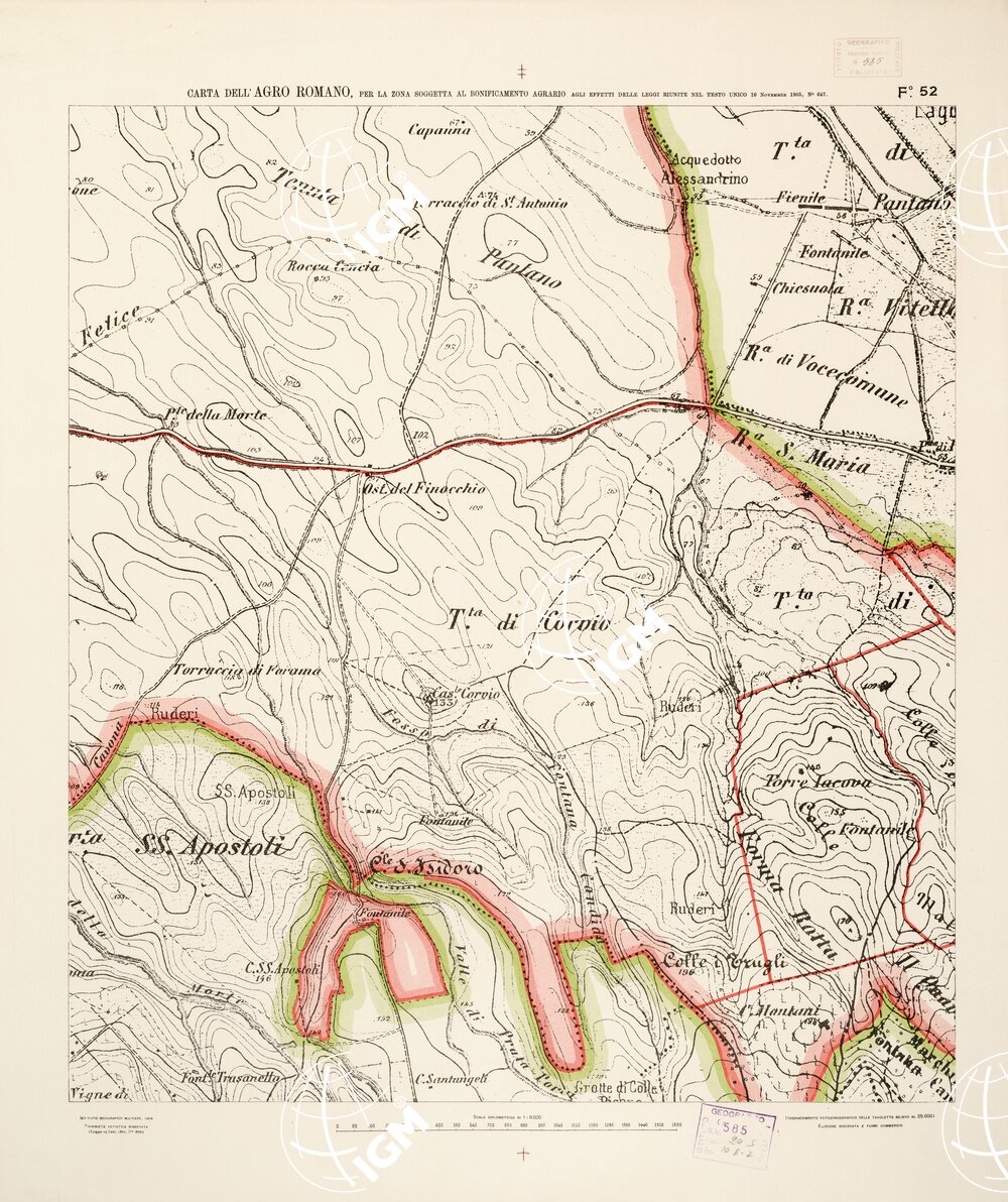 Ingrandimento fotozincografico in 77 fogli delle tavolette rilievo al 25.000. Stampa a colori in azzurro per le acque, verde per i limiti dell’agro romano, rosso per quelli della zona soggetta alla bonifica agraria, viola per il territorio suburbano di Roma, rosso per le tenute e le loro divisioni interne; azzurro per le linee di spartiacque; resto della planimetria in nero. Orografia a curve tracciate alla equidistanza di 5 metri. Annesso un quadro d’unione con elenco delle tenute private.