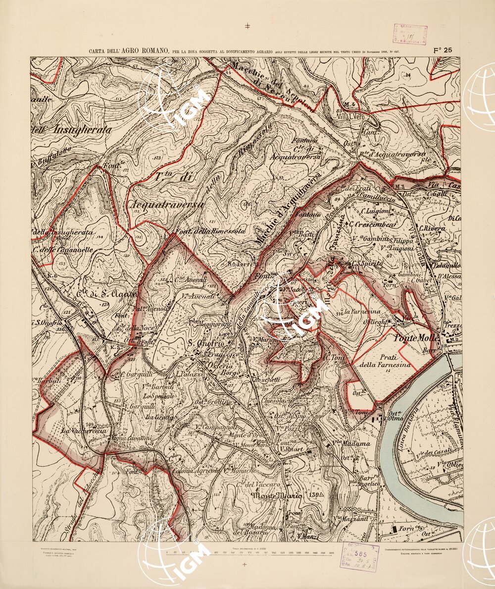 Ingrandimento fotozincografico in 77 fogli delle tavolette rilievo al 25.000. Stampa a colori in azzurro per le acque, verde per i limiti dell’agro romano, rosso per quelli della zona soggetta alla bonifica agraria, viola per il territorio suburbano di Roma, rosso per le tenute e le loro divisioni interne; azzurro per le linee di spartiacque; resto della planimetria in nero. Orografia a curve tracciate alla equidistanza di 5 metri. Annesso un quadro d’unione con elenco delle tenute private.