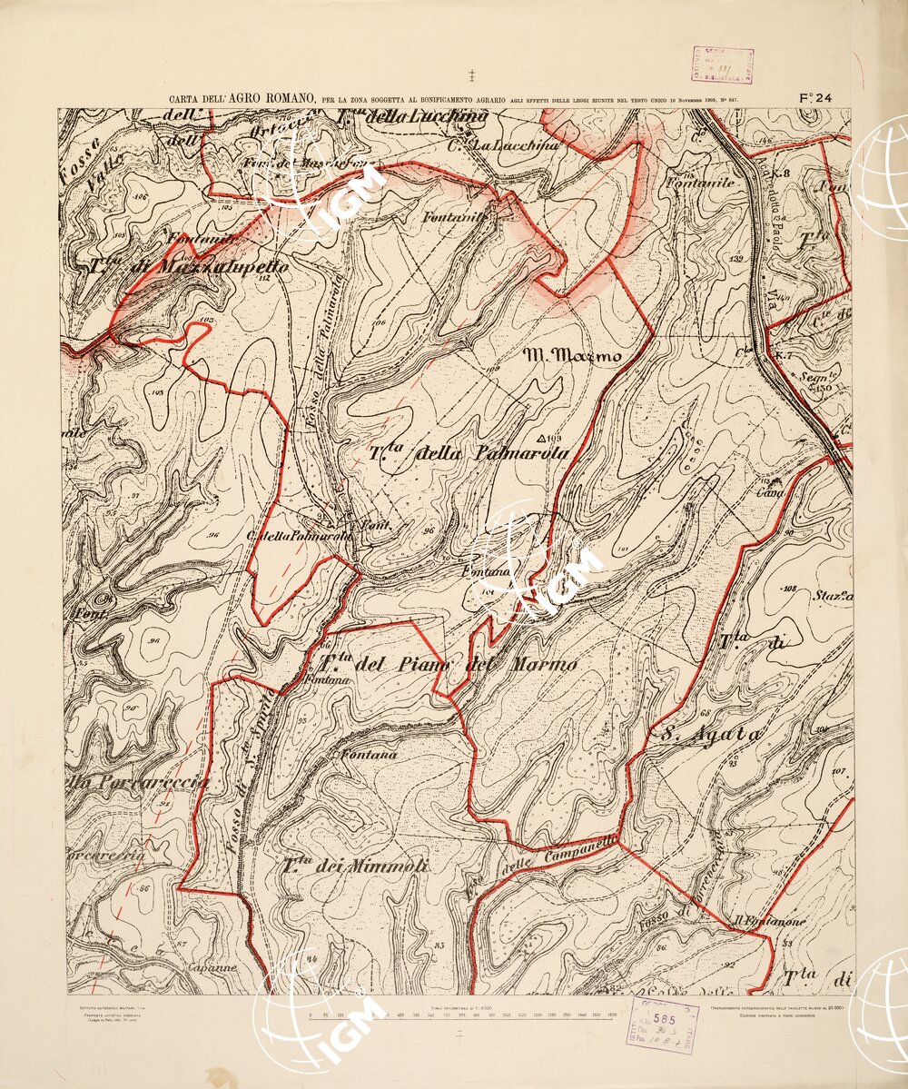 Ingrandimento fotozincografico in 77 fogli delle tavolette rilievo al 25.000. Stampa a colori in azzurro per le acque, verde per i limiti dell’agro romano, rosso per quelli della zona soggetta alla bonifica agraria, viola per il territorio suburbano di Roma, rosso per le tenute e le loro divisioni interne; azzurro per le linee di spartiacque; resto della planimetria in nero. Orografia a curve tracciate alla equidistanza di 5 metri. Annesso un quadro d’unione con elenco delle tenute private.