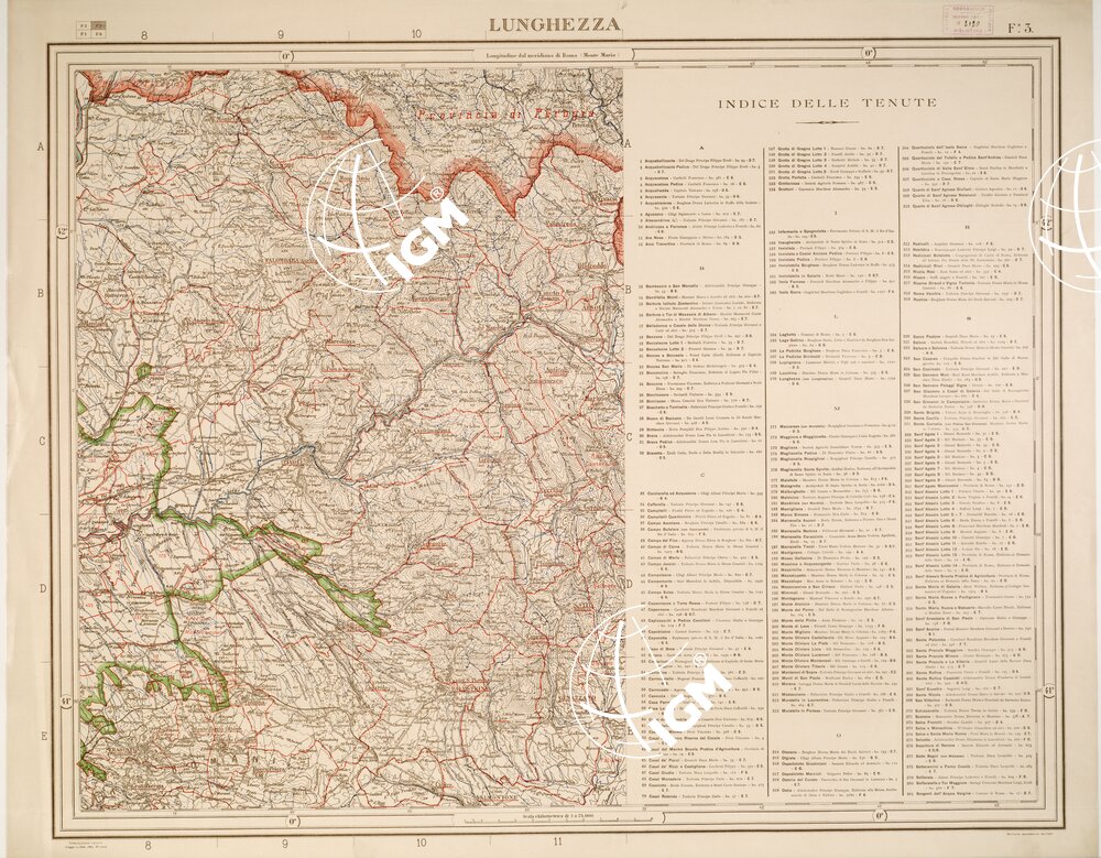 Carta in quattro fogli coi confini delle tenute e dei territori comunali limitrofi, delineata sulle carte dell’I.G.M. dal Cav. Agr. Pompeo Spinetti ispettore del Ministero di Agricoltura, Industria e Commercio.