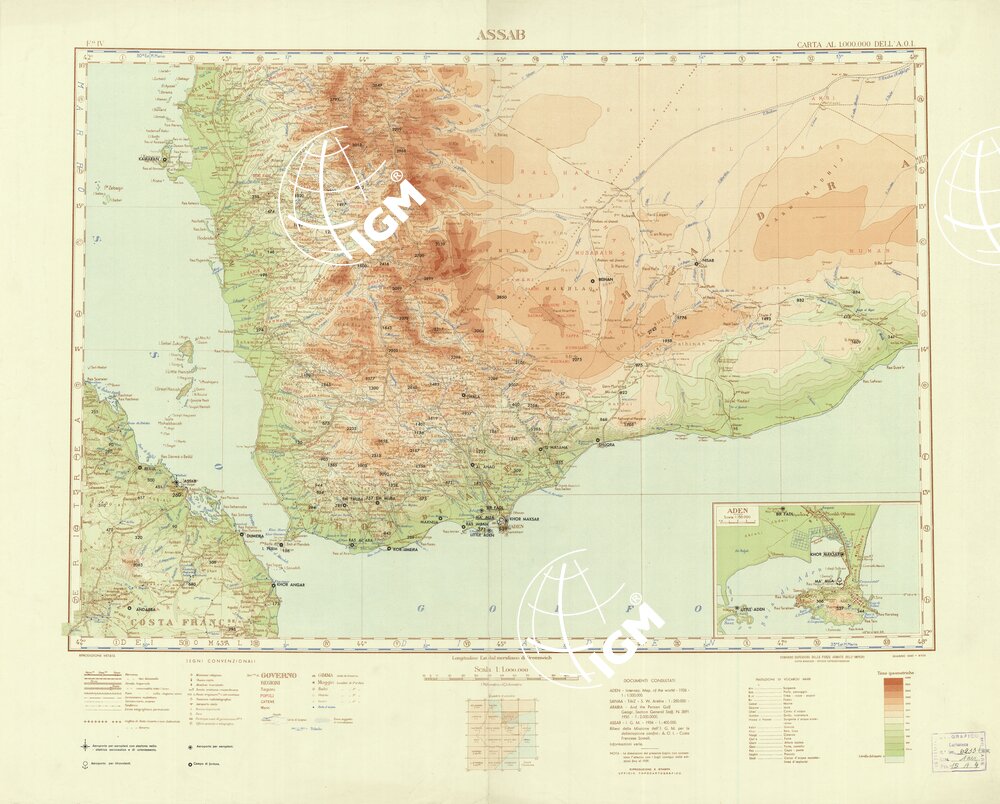 Le dimensioni del presente foglio non consentono l’attacco con i fogli contigui delle edizioni fino al 1939. La rappresentazione orografica è a tinte ipsometriche. In basso sono presenti: i segni convenzionali, la scala delle tinte ipsometriche e un quadro d’unione alla scala di 1:50.000.000. Nel riquadro in basso a destra: Aden alla scala di 1:150.000. Comando Superiore delle Forze Armate dell’Impero, Stato Maggiore Ufficio Topocartografico.