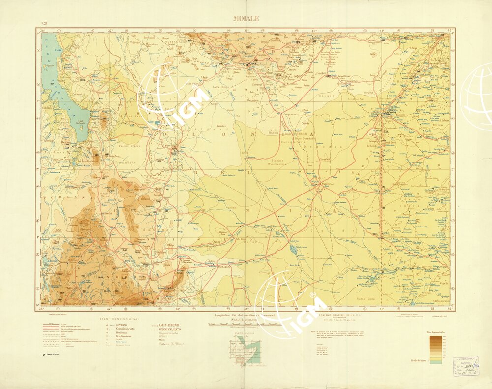 La presente carta è dedotta dal milionesimo internazionale edito dall’I.G.M. nel 1936 da ricognizioni, da informazioni e documenti vari. Le curve sono dimostrative, le strade di grande traffico sono a sfondo bianco. La rappresentazione orografica è a tinte ipsometriche. In basso sono presenti: i segni convenzionali, la scala delle tinte ipsometriche e un quadro d’unione alla scala di 1:50.000.000. Governo Generale dell’A.O.I. Stato Maggiore, Ufficio Topocartografico.