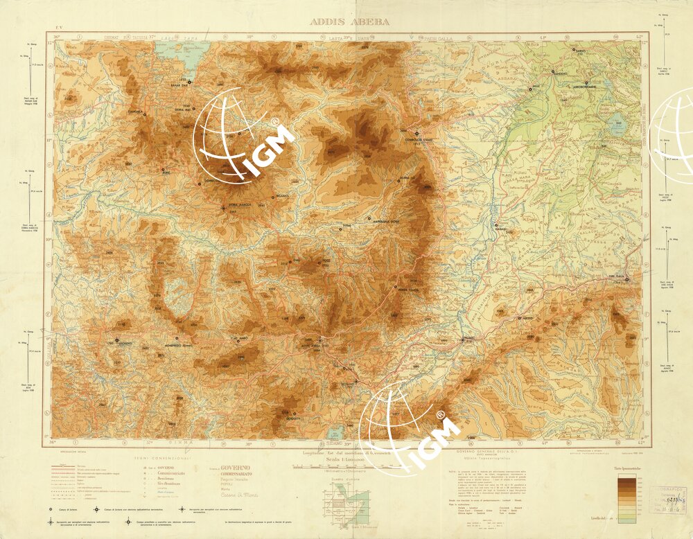 La presente carta è dedotta dal milionesimo internazionale edito dall’I.G.M. nel 1934 da rilievi, ricognizioni, informazioni e documenti vari. Le curve sono dimostrative, le strade di grande traffico sono a sfondo bianco. I tratti di strada in costruzione sono rappresentati come costruiti. L’attacco sul lato Ovest (nel tratto tra l’8° ed il 10° parallelo) e quello sul lato Sud (nel tratto tra il 36° ed il 38° meridiano) non corrispondono a quelli dei fogli di Gambela e Lago Margherita (agosto 1938): e ciò in dipendenza degli elementi geometrici successivamente raccolti. La rappresentazione orografica è a tinte ipsometriche. In basso sono presenti: i segni convenzionali, la scala delle tinte ipsometriche e un quadro d’unione alla scala di 1:50.000.000. Governo Generale dell’A.O.I. Stato Maggiore, Ufficio Topocartografico.