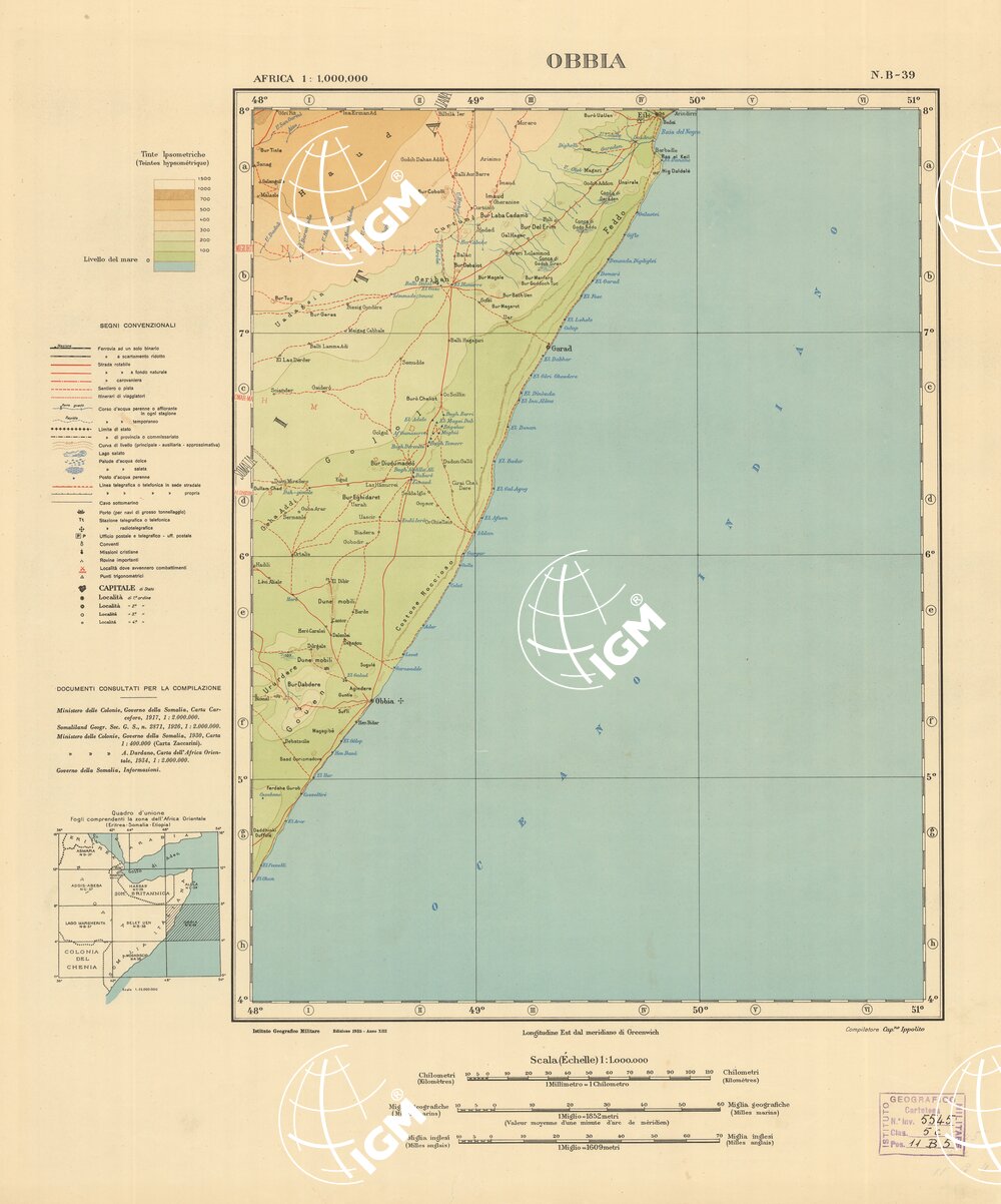 Rappresentazione orografica a tinte ipsometriche. In fondo alla carta sono presenti varie scale. Sul lato sinistro della carta: un quadro d’unione alla scala di 1:25.000.000, i segni convenzionali, i documenti consultati per la compilazione e la scala delle tinte ipsometriche. La carta si compone di 14 fogli di cui 7 al n. di inventario 5545 e 7 al n. di inventario 5545 bis. I.G.M. (FI)