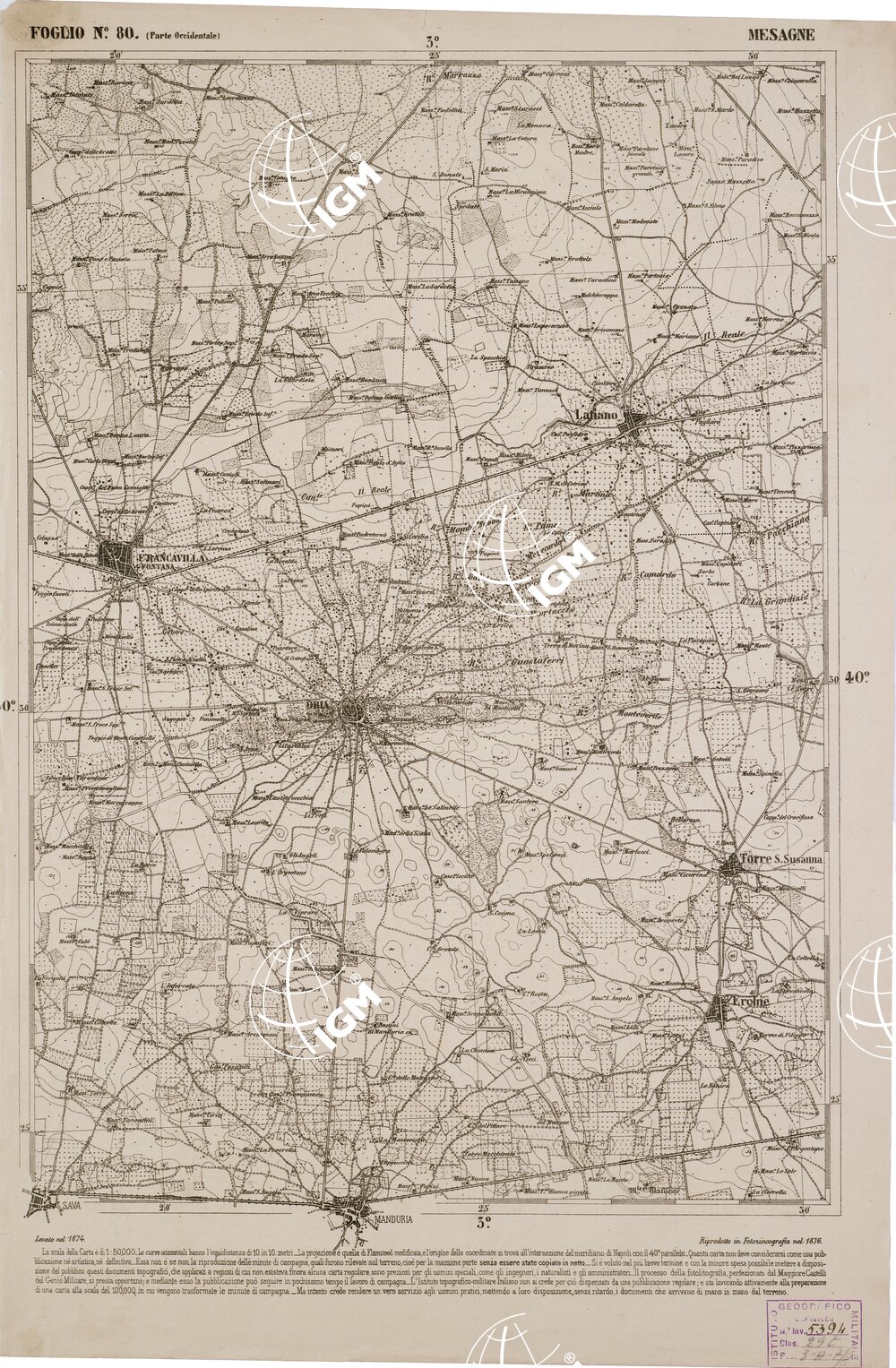 CARTA DELL' ITALIA MERIDIONALE EDITA DALL'ISTITUTO TOPOGRAFICO MILITARE ITALIANO – Foglio 80 parte occidentale – Mesagne