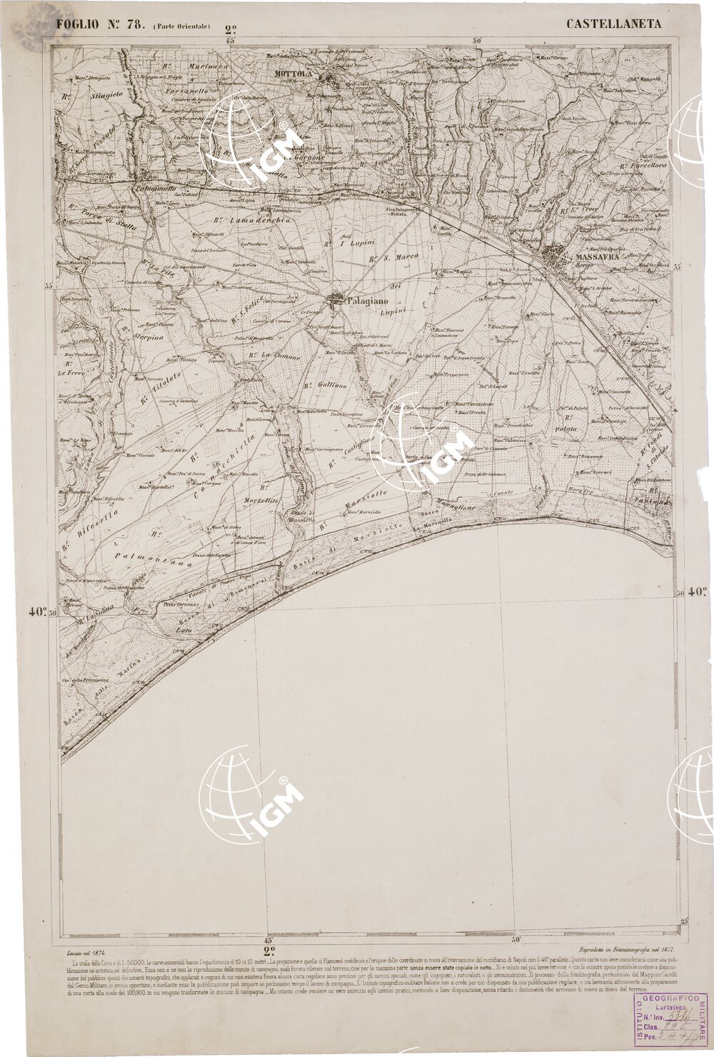 CARTA DELL' ITALIA MERIDIONALE EDITA DALL'ISTITUTO TOPOGRAFICO MILITARE ITALIANO – Foglio 78 parte orientale – Castellaneta