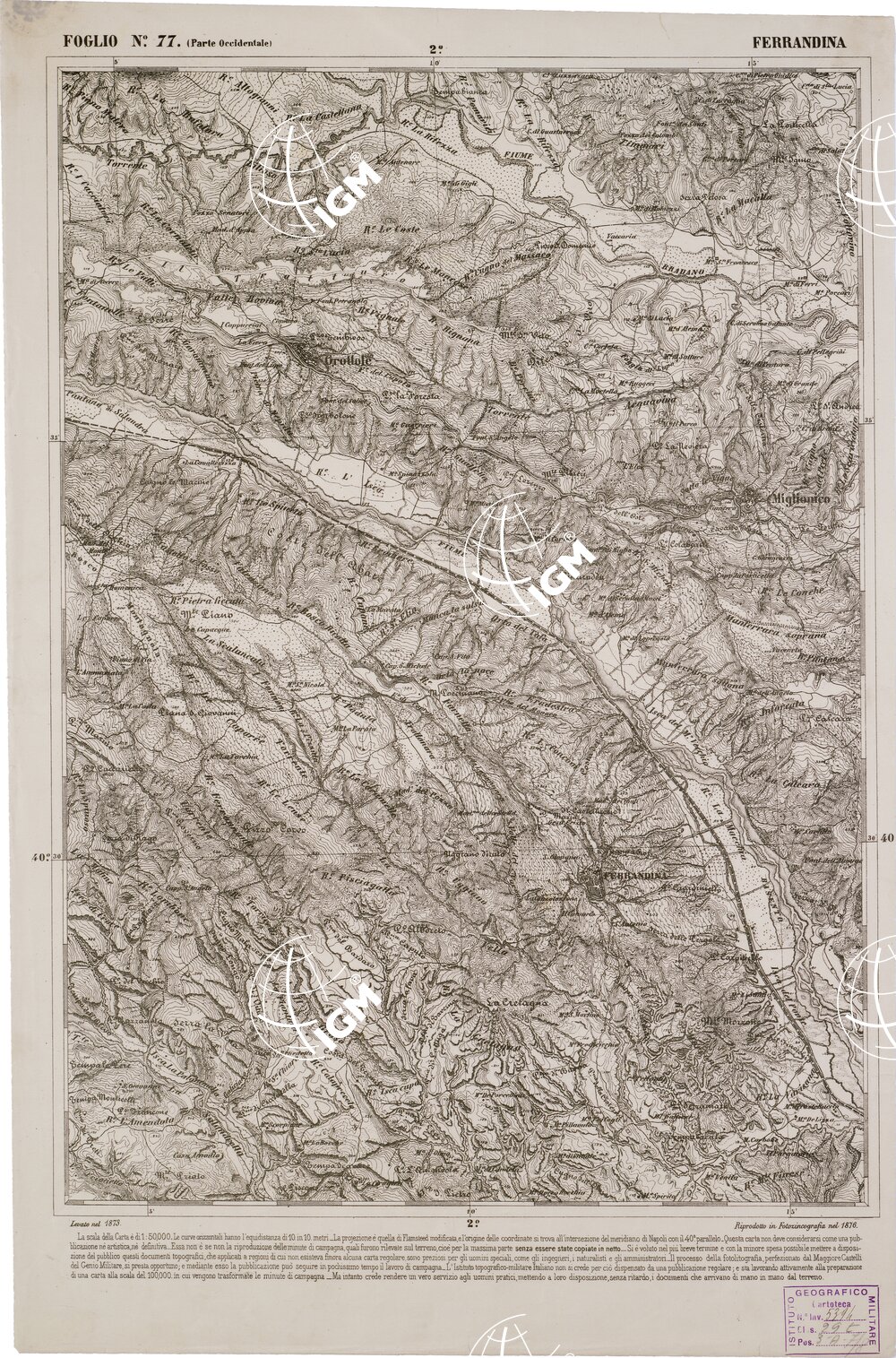 CARTA DELL' ITALIA MERIDIONALE EDITA DALL'ISTITUTO TOPOGRAFICO MILITARE ITALIANO – Foglio 77 parte occidentale – Ferrandina