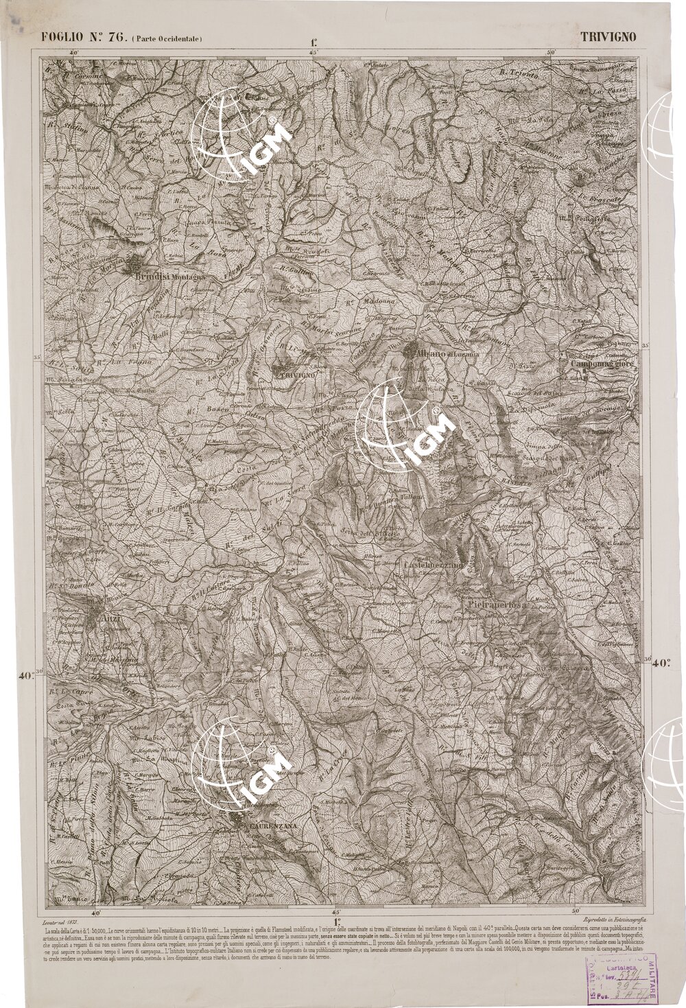 CARTA DELL' ITALIA MERIDIONALE EDITA DALL'ISTITUTO TOPOGRAFICO MILITARE ITALIANO – Foglio 76 parte occidentale – Trivigno