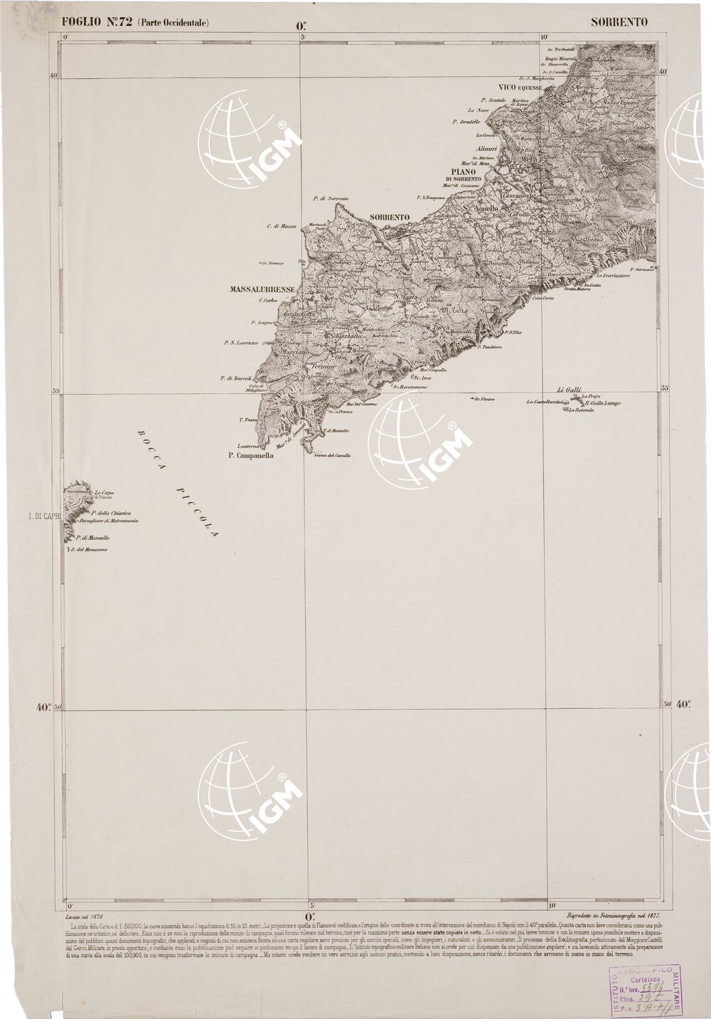 CARTA DELL' ITALIA MERIDIONALE EDITA DALL'ISTITUTO TOPOGRAFICO MILITARE ITALIANO – Foglio 72 parte occidentale – Sorrento