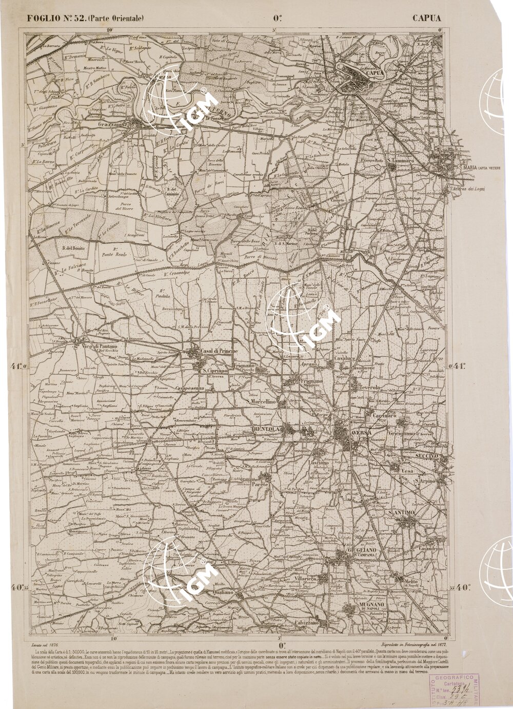 CARTA DELL' ITALIA MERIDIONALE EDITA DALL'ISTITUTO TOPOGRAFICO MILITARE ITALIANO – Foglio 52 parte orientale – Capua
