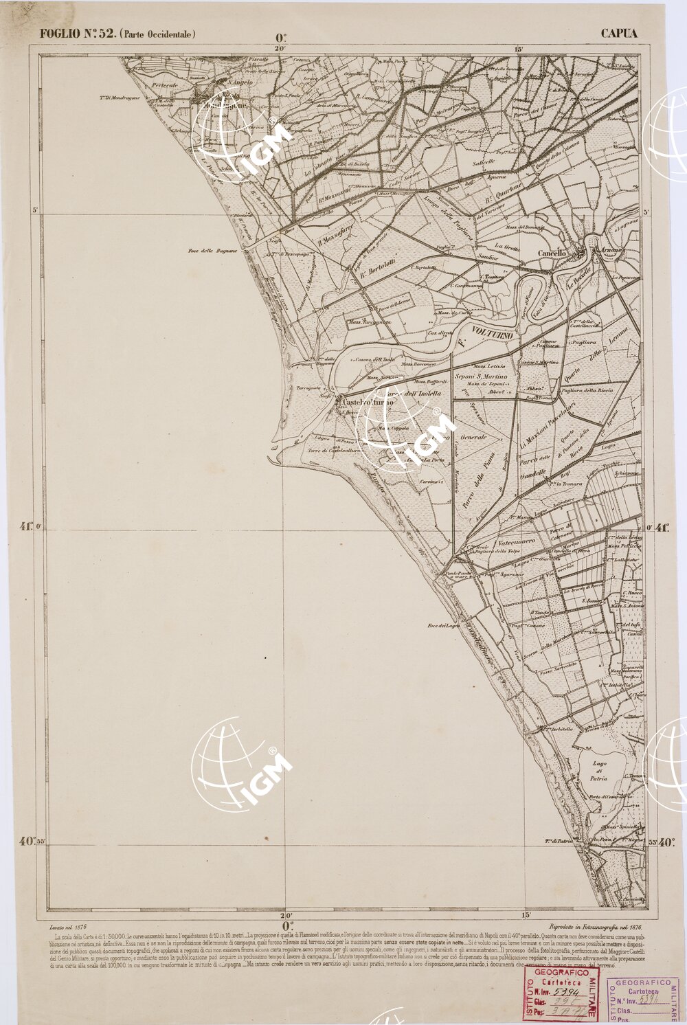 CARTA DELL’ ITALIA MERIDIONALE EDITA DALL’ISTITUTO TOPOGRAFICO MILITARE ITALIANO – Foglio 52 parte occidentale – Capua