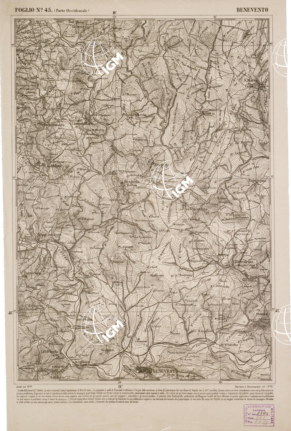 CARTA DELL' ITALIA MERIDIONALE EDITA DALL'ISTITUTO TOPOGRAFICO MILITARE ITALIANO – Foglio 45 parte occidentale – Benevento