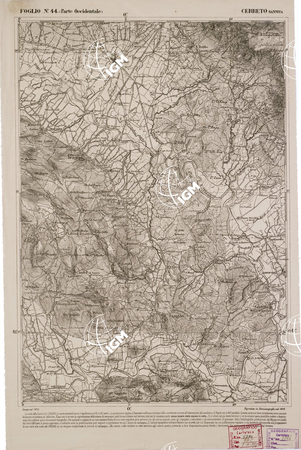 CARTA DELL' ITALIA MERIDIONALE EDITA DALL'ISTITUTO TOPOGRAFICO MILITARE ITALIANO – Foglio 44 parte occidentale – Cerreto Sannita