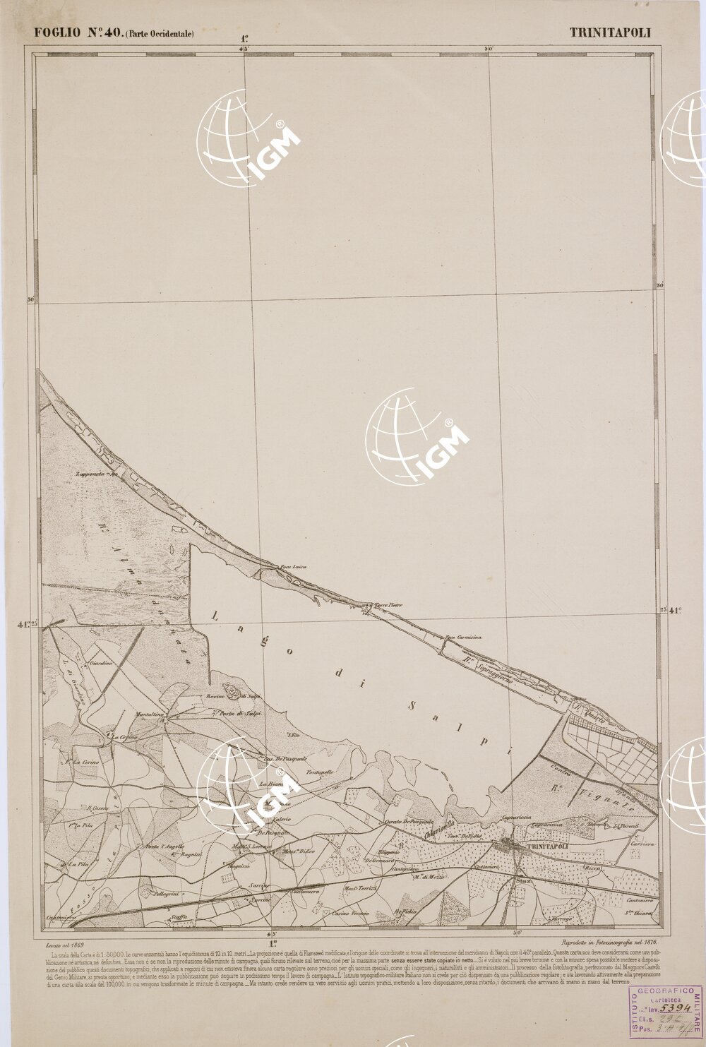 CARTA DELL' ITALIA MERIDIONALE EDITA DALL'ISTITUTO TOPOGRAFICO MILITARE ITALIANO – Foglio 40 parte occidentale – Trinitapoli