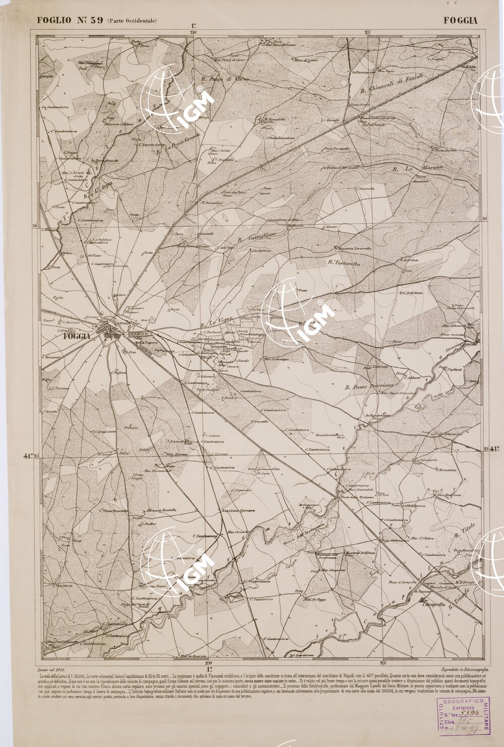 CARTA DELL' ITALIA MERIDIONALE EDITA DALL'ISTITUTO TOPOGRAFICO MILITARE ITALIANO – Foglio 39 parte occidentale – Foggia