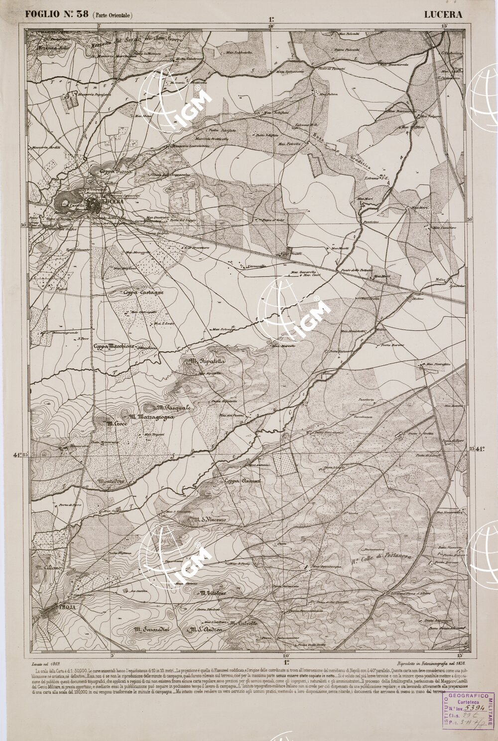 CARTA DELL' ITALIA MERIDIONALE EDITA DALL'ISTITUTO TOPOGRAFICO MILITARE ITALIANO – Foglio 38 parte orientale – Lucera