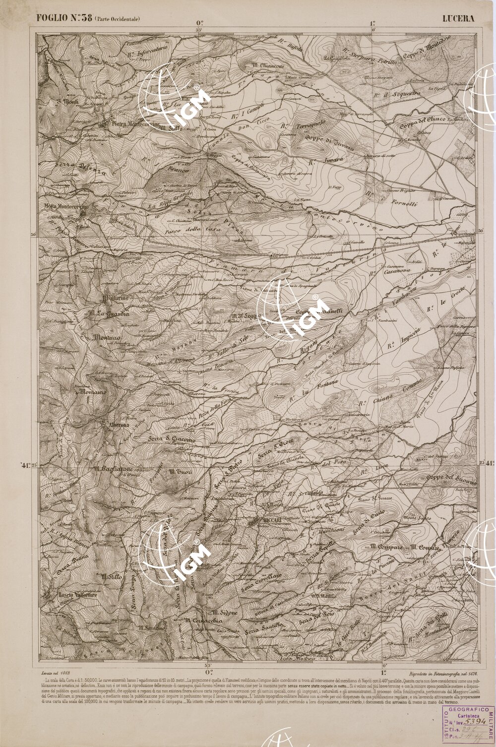 CARTA DELL' ITALIA MERIDIONALE EDITA DALL'ISTITUTO TOPOGRAFICO MILITARE ITALIANO – Foglio 38 parte occidentale – Lucera