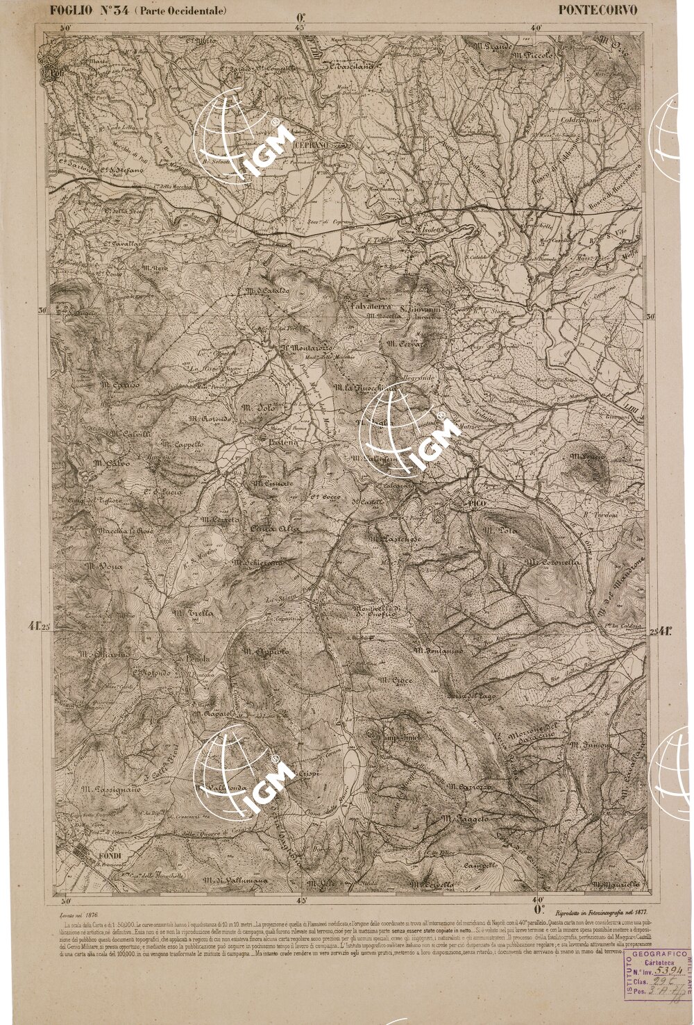 CARTA DELL' ITALIA MERIDIONALE EDITA DALL'ISTITUTO TOPOGRAFICO MILITARE ITALIANO – Foglio 34 parte occidentale – Pontecorvo