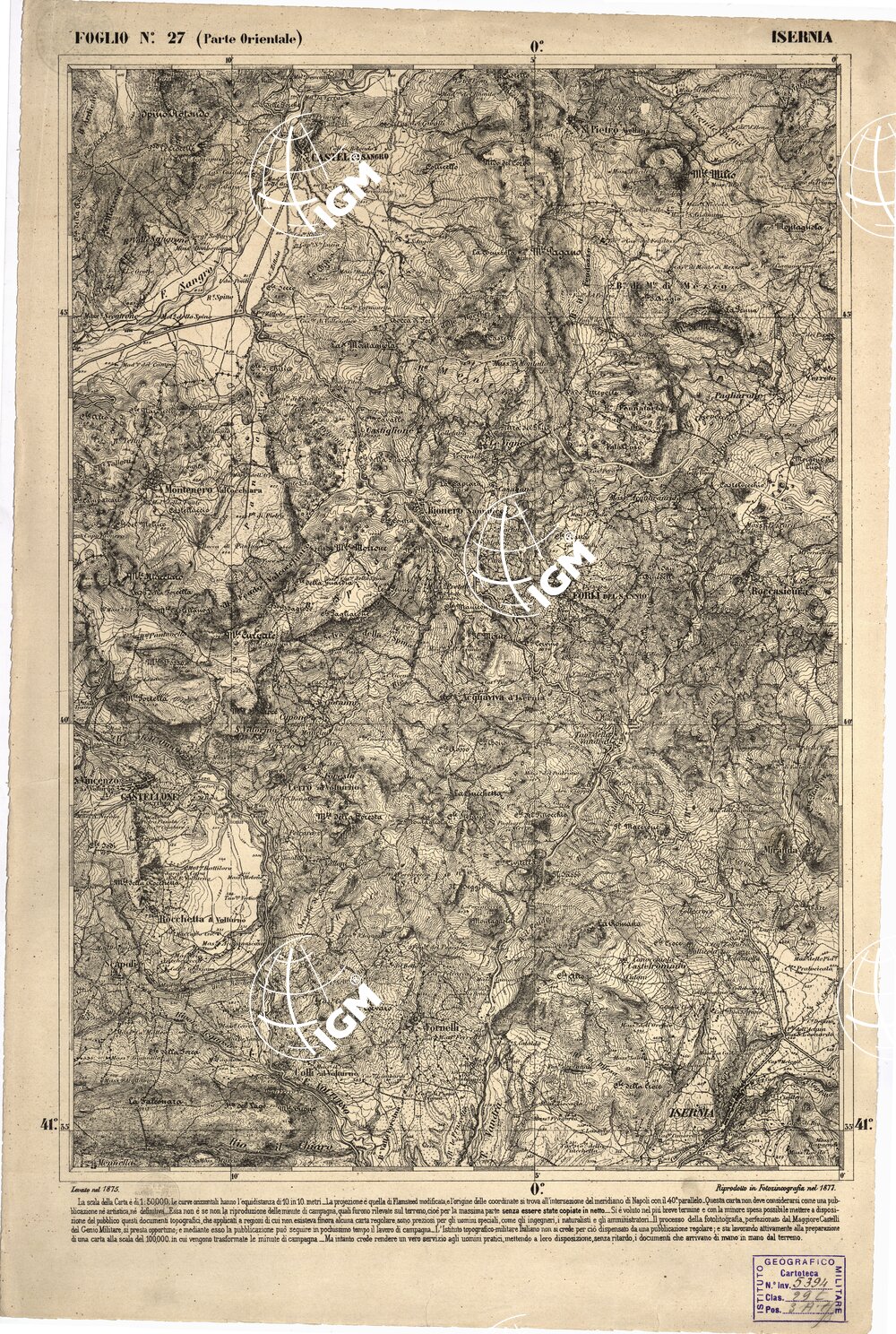 CARTA DELL’ ITALIA MERIDIONALE EDITA DALL’ISTITUTO TOPOGRAFICO MILITARE ITALIANO – Foglio 27 parte orientale – Isernia