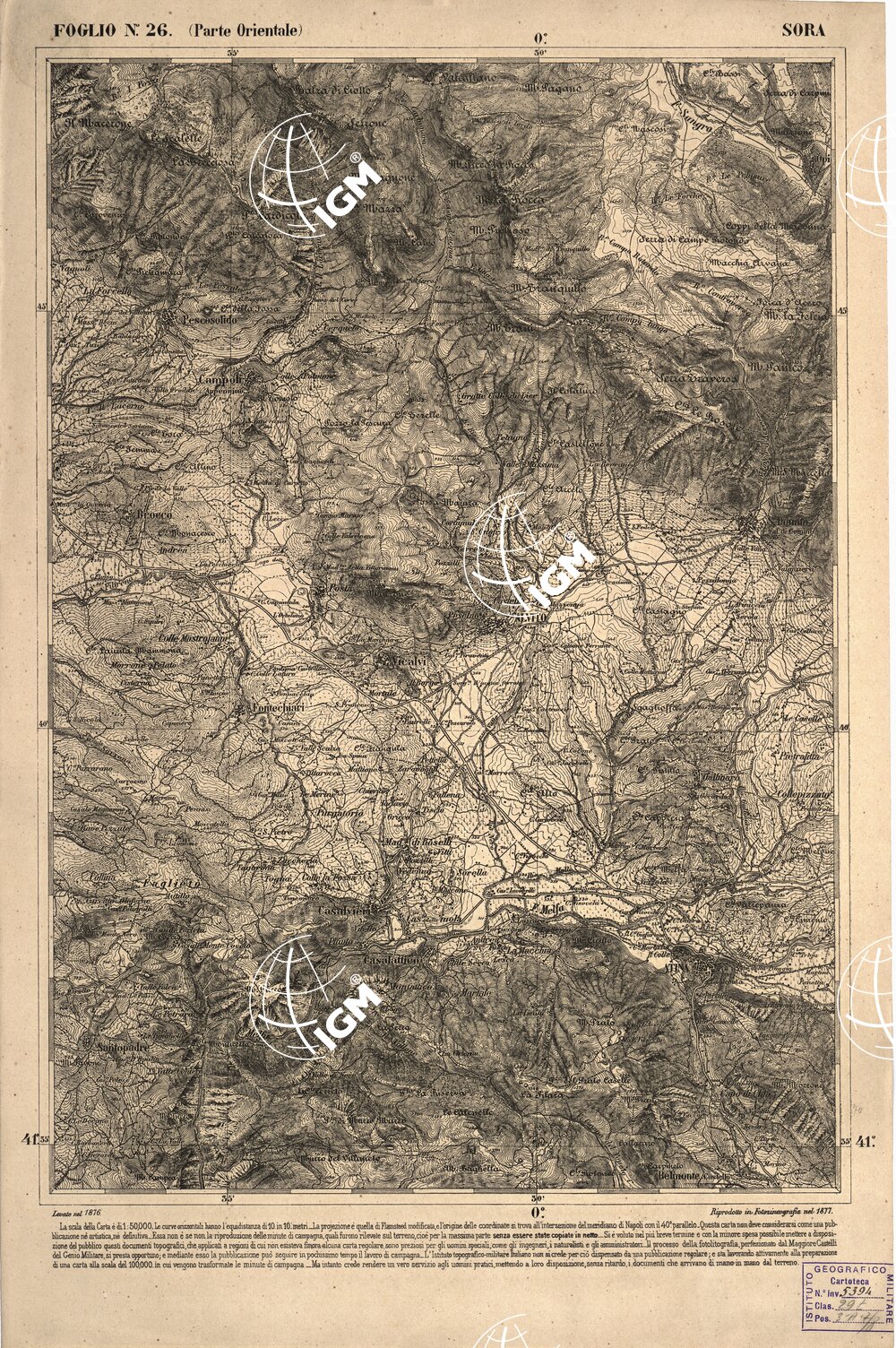 CARTA DELL' ITALIA MERIDIONALE EDITA DALL'ISTITUTO TOPOGRAFICO MILITARE ITALIANO – Foglio 26 parte orientale – Sora
