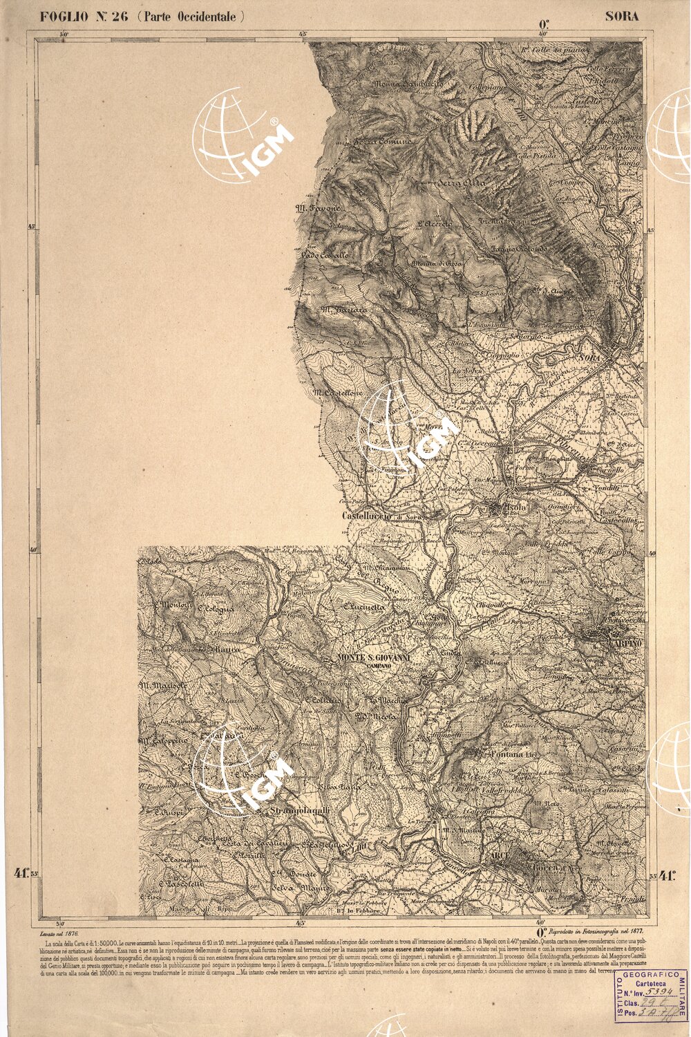 CARTA DELL' ITALIA MERIDIONALE EDITA DALL'ISTITUTO TOPOGRAFICO MILITARE ITALIANO – Foglio 26 parte occidentale – Sora