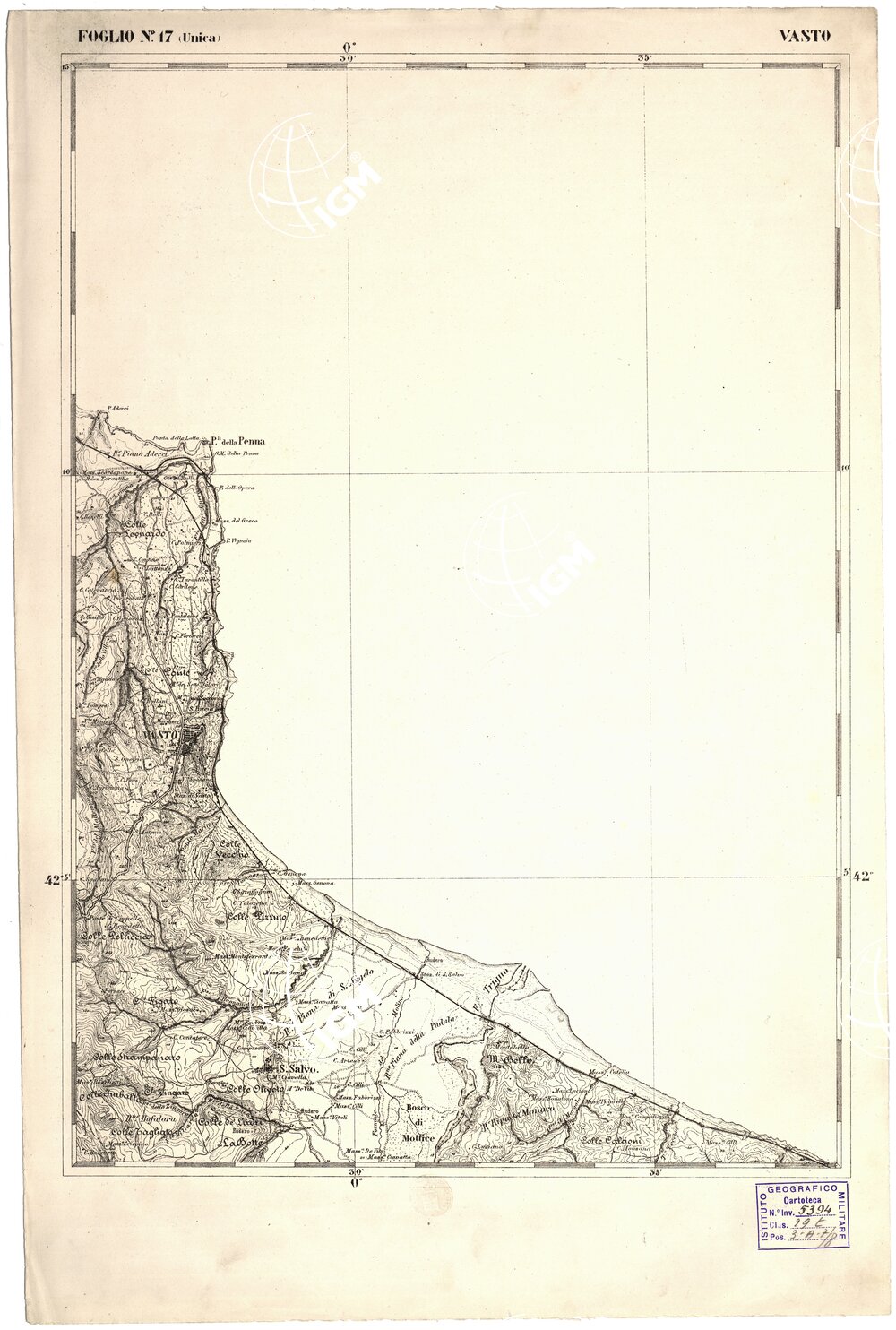 CARTA DELL’ ITALIA MERIDIONALE EDITA DALL’ISTITUTO TOPOGRAFICO MILITARE ITALIANO – Foglio 17 – Vasto