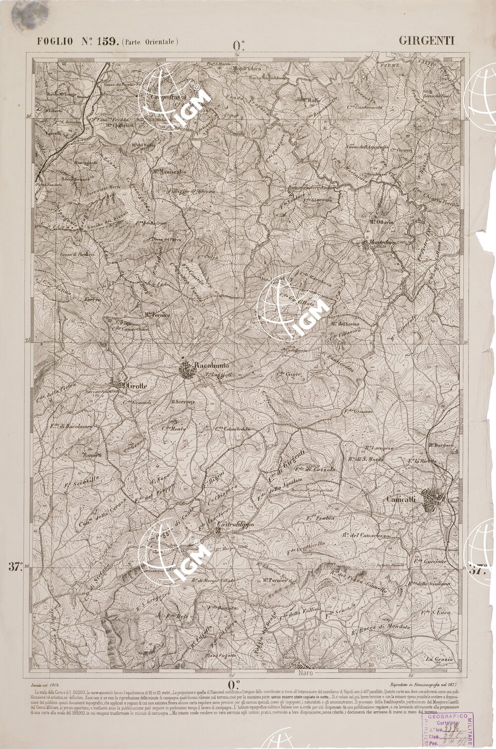 CARTA DELL' ITALIA MERIDIONALE EDITA DALL'ISTITUTO TOPOGRAFICO MILITARE ITALIANO -Foglio 159 parte orientale – Girgenti