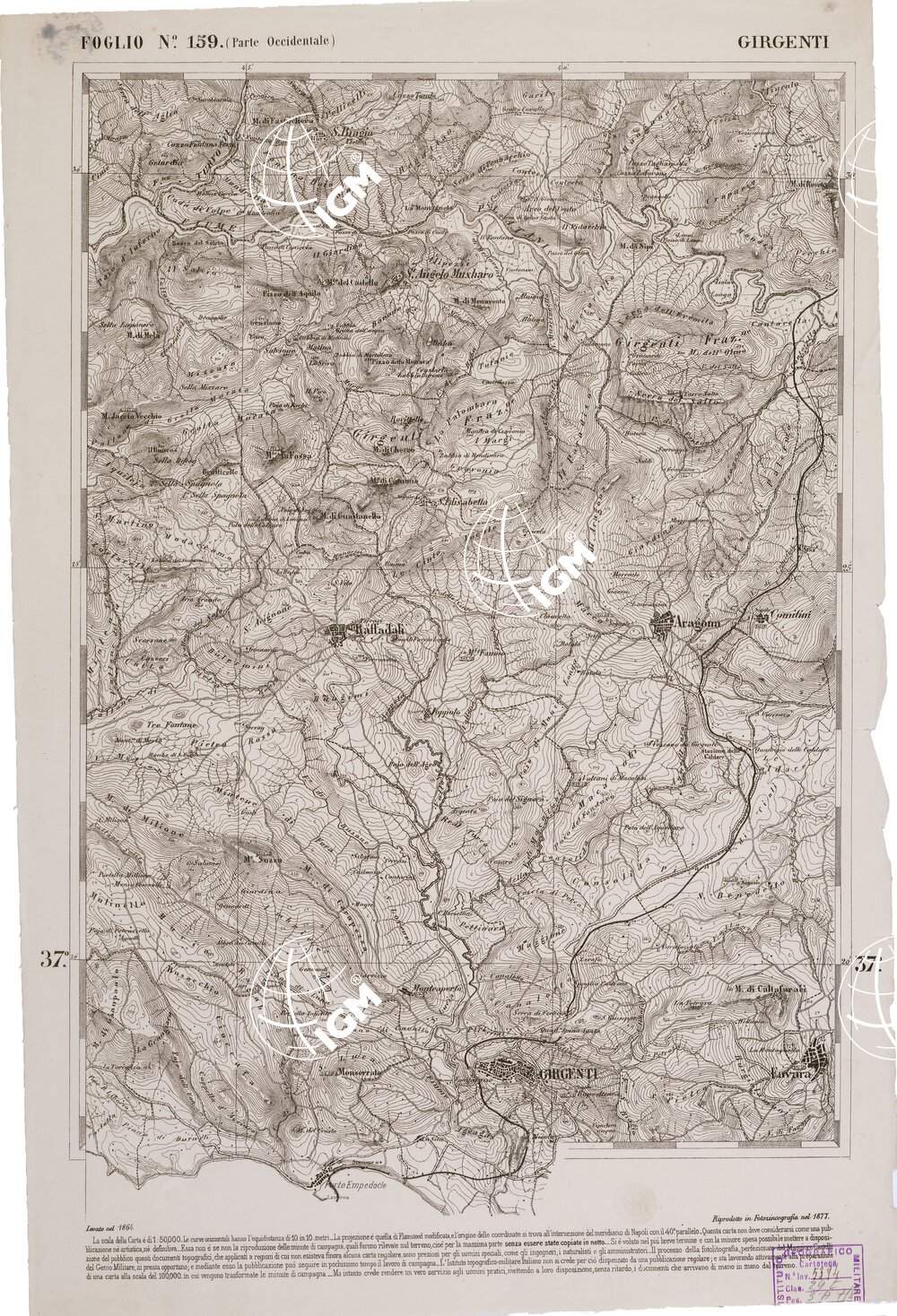 CARTA DELL' ITALIA MERIDIONALE EDITA DALL'ISTITUTO TOPOGRAFICO MILITARE ITALIANO – Foglio 159 parte occidentale – Girgenti