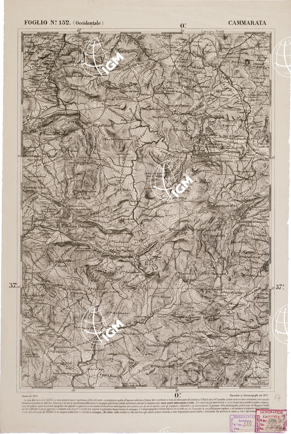 CARTA DELL' ITALIA MERIDIONALE EDITA DALL'ISTITUTO TOPOGRAFICO MILITARE ITALIANO – Foglio 152 parte occidentale – Cammarata
