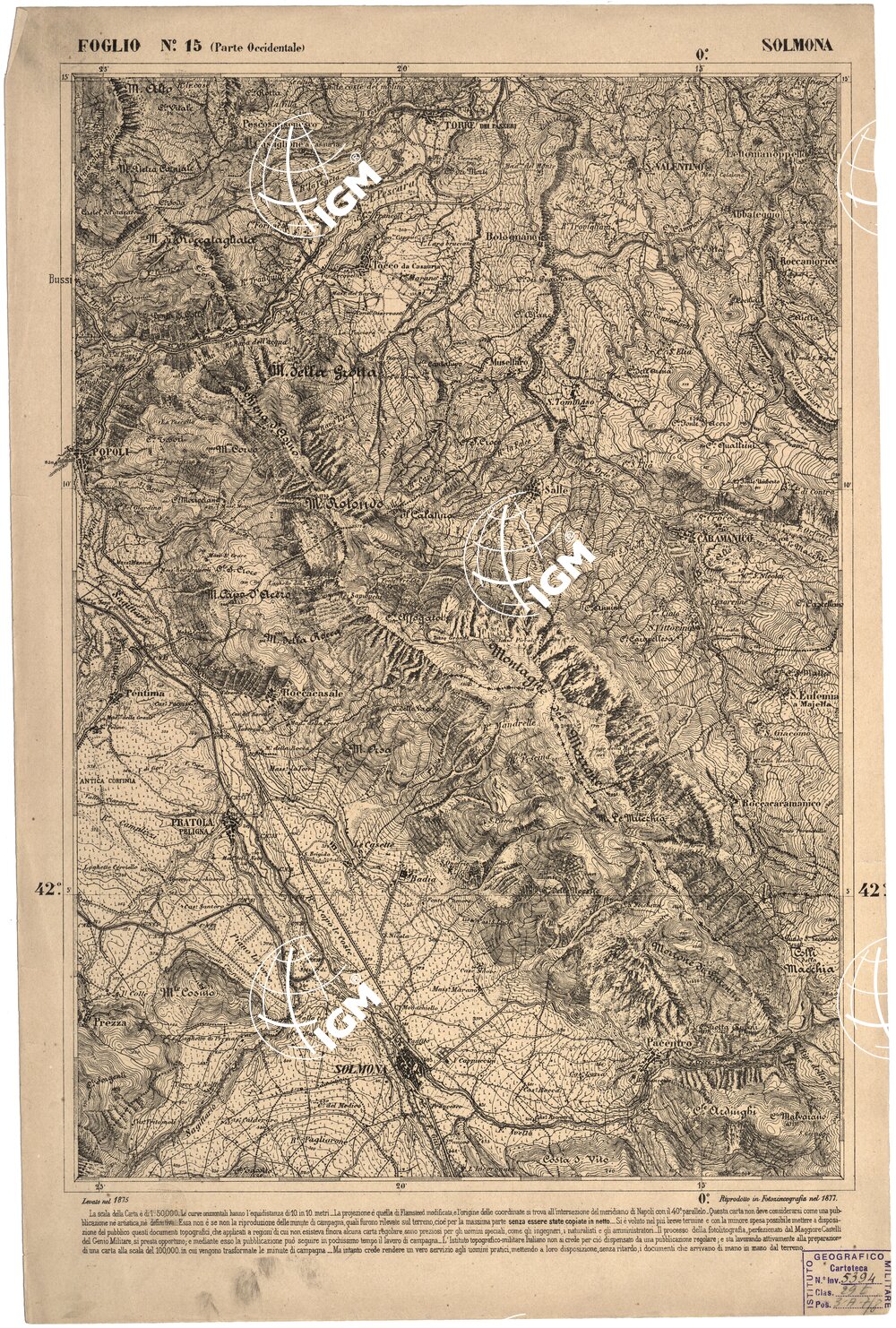CARTA DELL’ ITALIA MERIDIONALE EDITA DALL’ISTITUTO TOPOGRAFICO MILITARE ITALIANO – Foglio 15 parte occidentale – Solmona