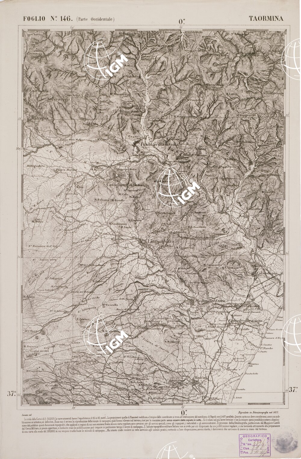 CARTA DELL' ITALIA MERIDIONALE EDITA DALL'ISTITUTO TOPOGRAFICO MILITARE ITALIANO – Foglio 146 parte occidentale – Taormina
