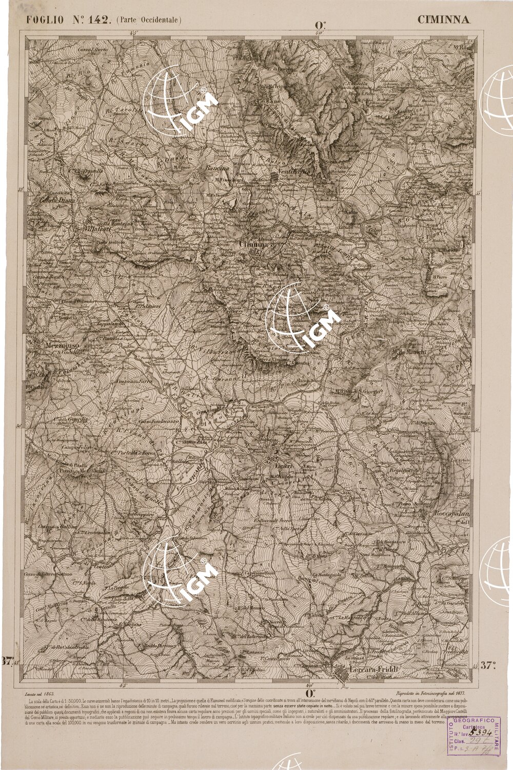 CARTA DELL' ITALIA MERIDIONALE EDITA DALL'ISTITUTO TOPOGRAFICO MILITARE ITALIANO – Foglio 142 parte occidentale – Ciminna