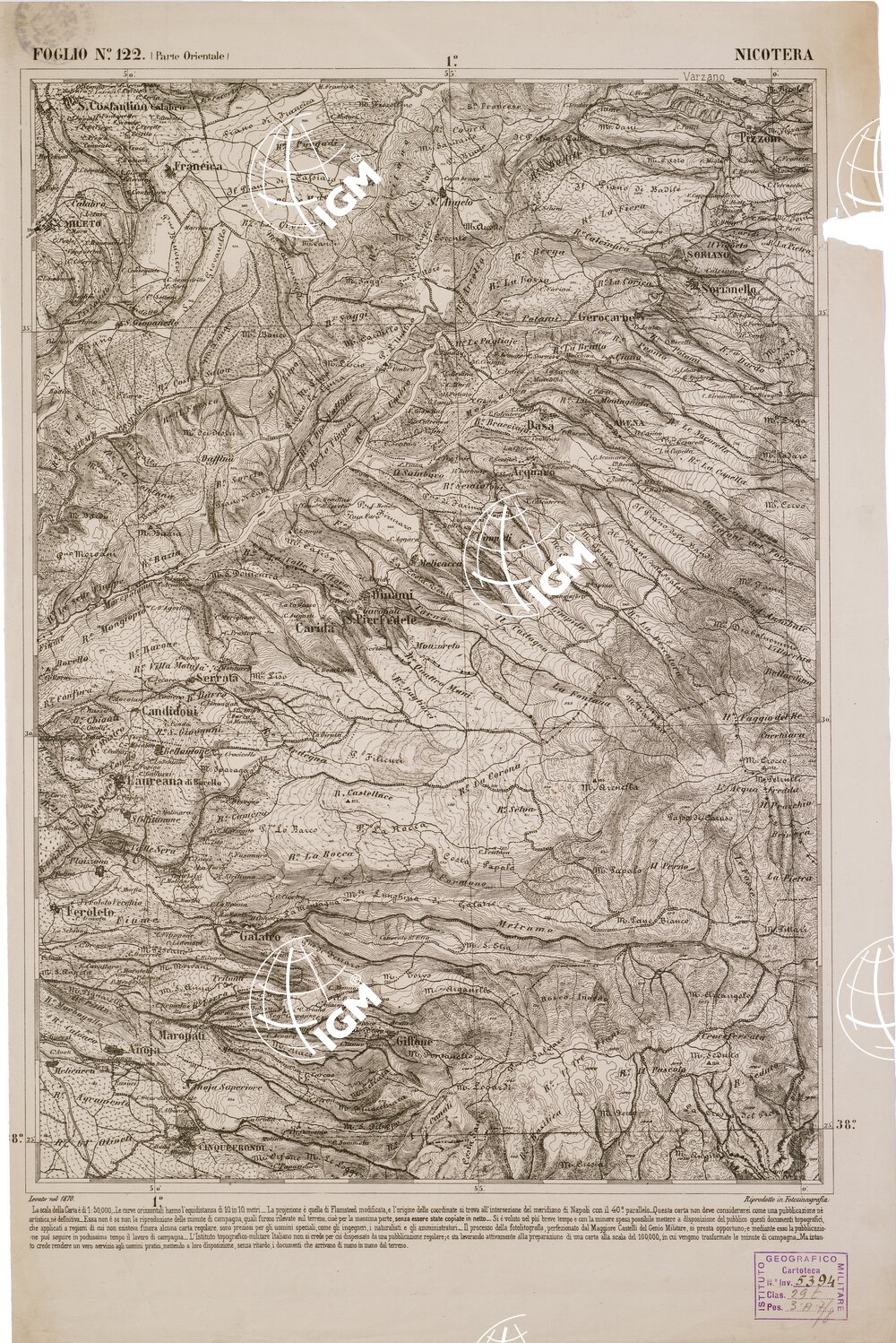 CARTA DELL' ITALIA MERIDIONALE EDITA DALL'ISTITUTO TOPOGRAFICO MILITARE ITALIANO – Foglio 122 parte orientale – Nicotera