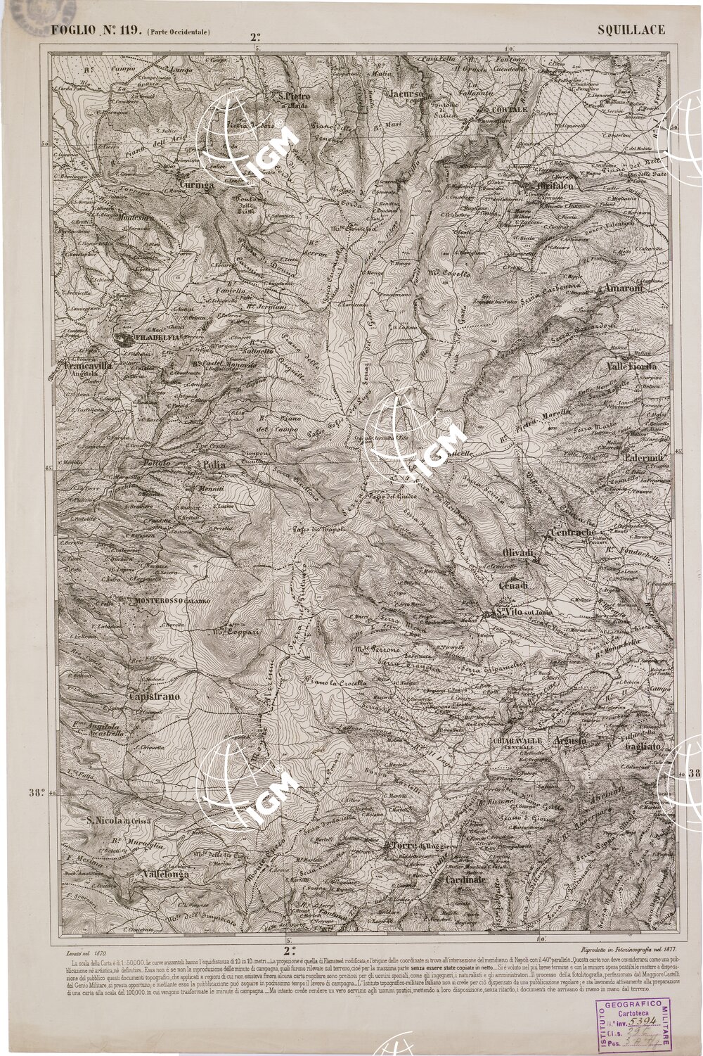 CARTA DELL' ITALIA MERIDIONALE EDITA DALL'ISTITUTO TOPOGRAFICO MILITARE ITALIANO – Foglio 119 parte occidentale – Squillace