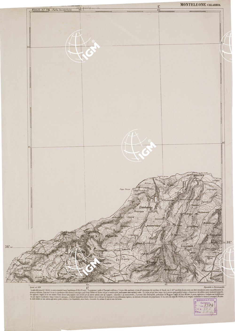 CARTA DELL' ITALIA MERIDIONALE EDITA DALL'ISTITUTO TOPOGRAFICO MILITARE ITALIANO – Foglio 118 parte occidentale – Monteleone Calabria