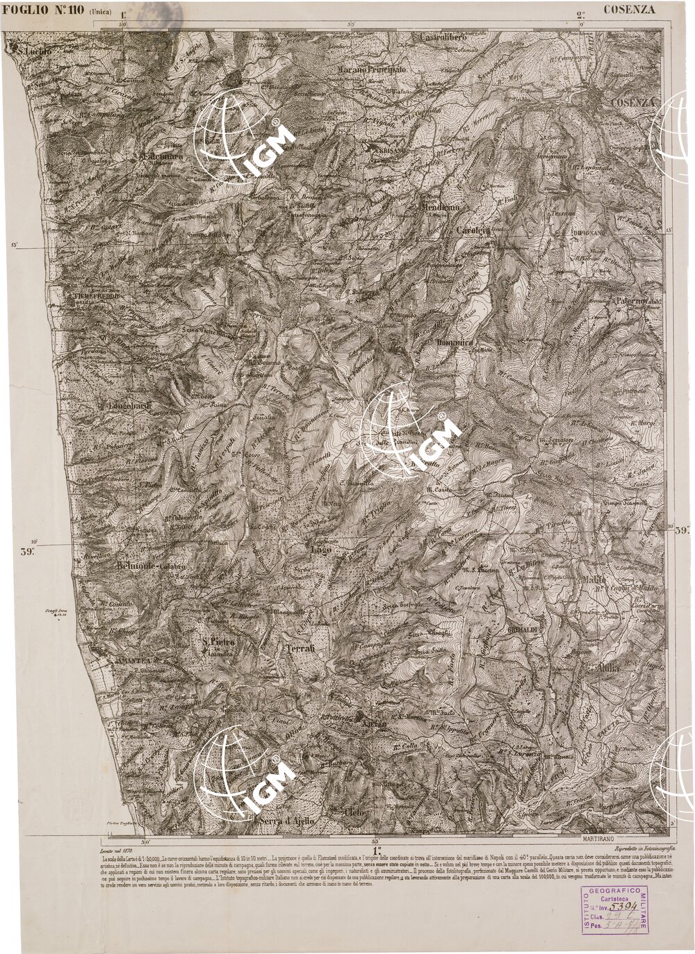 CARTA DELL’ ITALIA MERIDIONALE EDITA DALL’ISTITUTO TOPOGRAFICO MILITARE ITALIANO – Foglio 110 – Cosenza