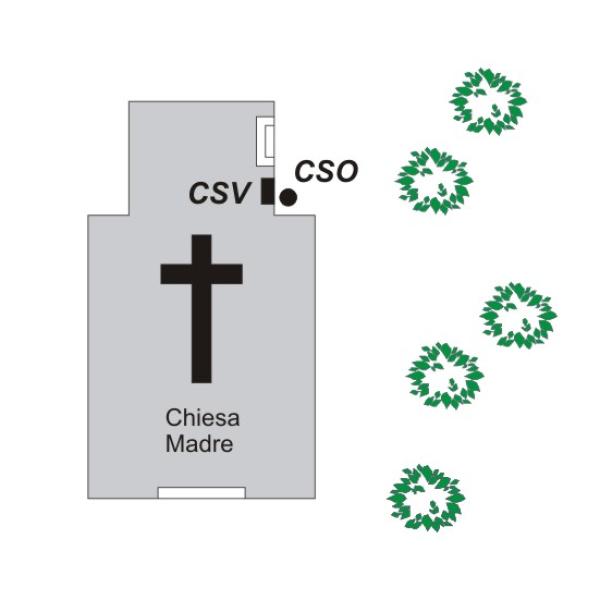 [{"simbolo_contrassegno":"P1","materializzazione":"(CSO) – Chiusino in ghisa stabilizzato nell'angolo formato dal campanile con la sacrestia"},{"simbolo_contrassegno":"V1","materializzazione":"(CSV) – Mensola infissa sulla facciata del campanile in corrispondenza del CSO"}]