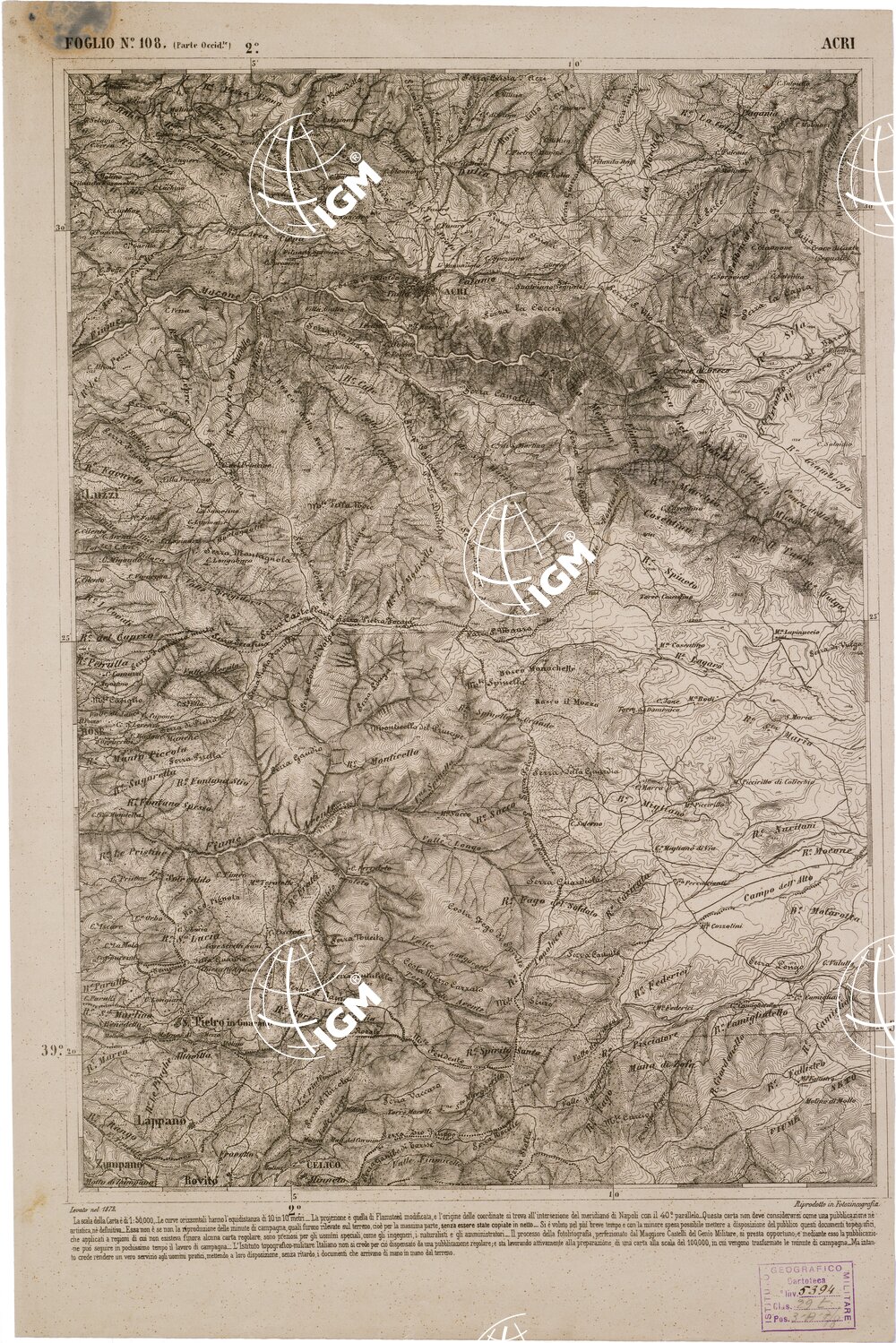 CARTA DELL' ITALIA MERIDIONALE EDITA DALL'ISTITUTO TOPOGRAFICO MILITARE ITALIANO – Foglio 108 parte occidentale – Acri