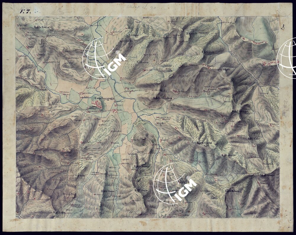 Il titolo non è presente sulla carta. La carta consta di 24 fogli. I primi quattro fogli provengono da ridisegni mentre gli altri venti sono rilievi originali di campagna e sono in parte costituiti da spezzoni riuniti. Orografia acquerellata a luce obliqua. Qualche foglio reca la firma dei tenenti Salius, Ricci e Morozzo.