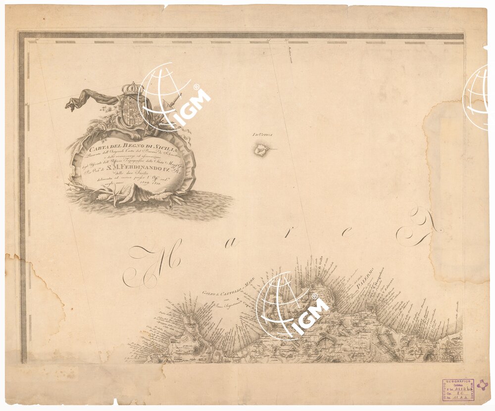 Carta in quattro fogli riuniti e montati su tela finemente incisa, basata su la revisione di quella dello Schmettau (v. n. 5 d’ordine, Cart. d’Arch. n. 97, n. d’Arch. 9092). Le ricognizioni tuttavia, eseguite con strumenti insufficienti, consentirono un miglioramento dell’originale, ma non permisero la creazione di una carta che rispondesse veramente alle nuove esigenze di esattezza. (Cfr. MORI A., La cartografia ufficiale in Italia e l’I.G.M., 1922). La copia posseduta reca tracciati a mano i confini a colori di 23 comarche: si suppone che possa trattarsi della delimitazione originale eseguita nel 1812 dal Canonico Piazzi per ordine del Governo della Sicilia. Confronta anche: col numero d’invent. 4664 la carta col medesimo titolo ai files B0012905-08 e al numero d’inv. 4664 ter. i files B0005202-03.